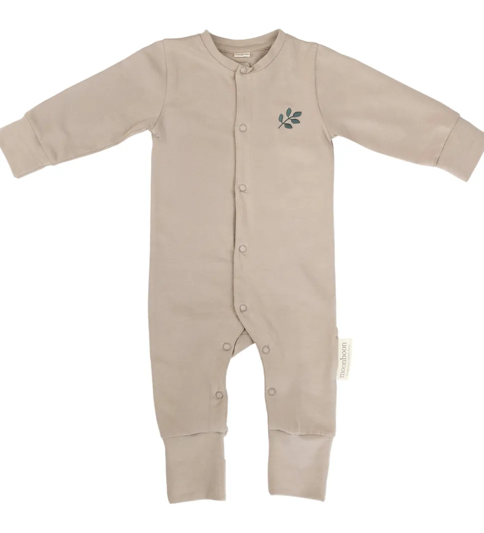 Dejlig Moonboon natdragt med babyhjelm i beige med en broderet bladgren. Moonboon natdragten med babyhjelm leveres i en fin gaveæske.