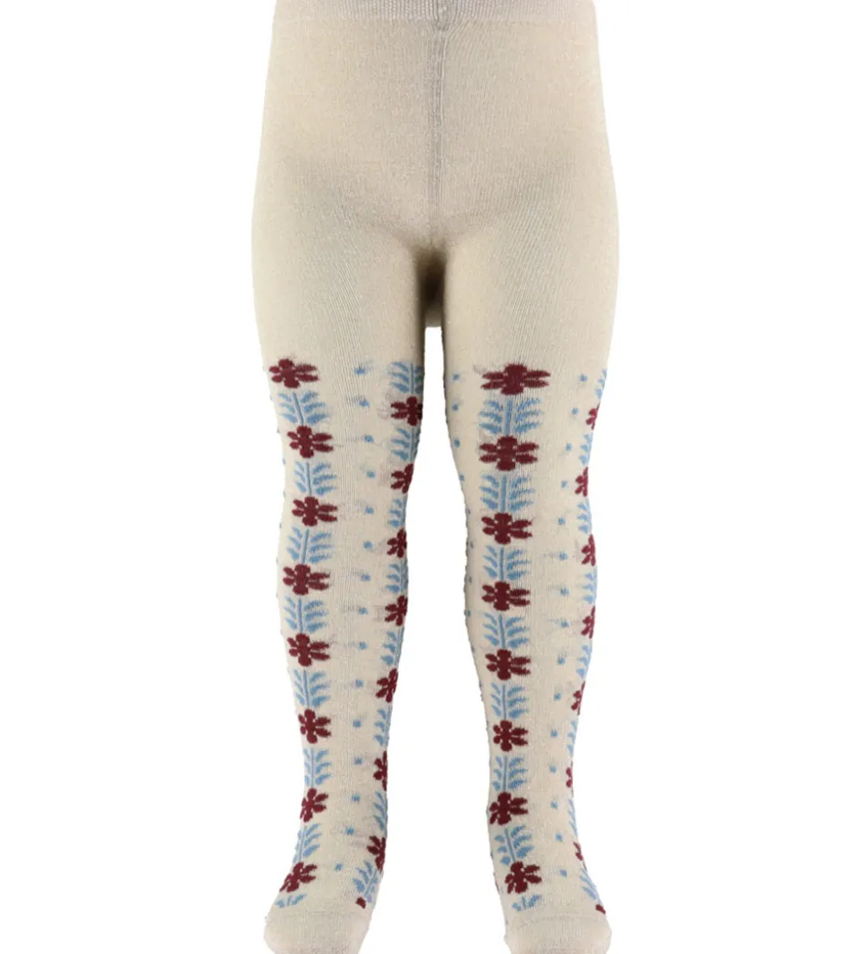 Charmerende MP strømpebukser i beige med glimmer og et mønster af røde blomster og blå blade. Strømpebukserne har en ribbet elastik i livet, hvilket sikrer en god pasform. Det bløde materiale og det flotte mønster gør MP strømpebukser til et behageligt valg.