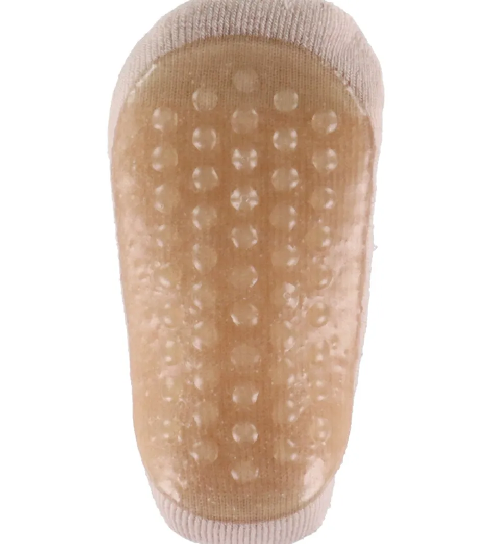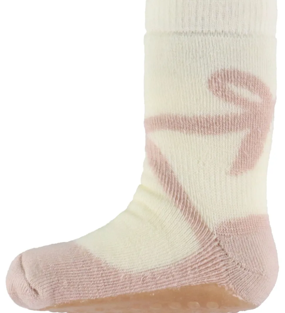 Smukke MP strømper i en blød kombination af creme og rosa med et elegant sløjfeprint. MP strømperne har et langt skaft med en behagelig ribkant øverst, som sikrer, at de sidder godt på benet. Sålens gummi-dotter giver ekstra greb til små fødder.