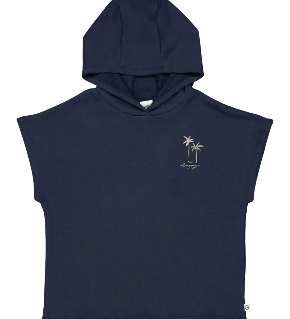 Smart Müsli hættetrøje i navyblå med broderede palmer og teksten “Enjoy” i beige. Hættetrøjen har en fastsyet blød hætte og er uden ærmer, så den er perfekt som et lag udenover en t-shirt eller bluse.