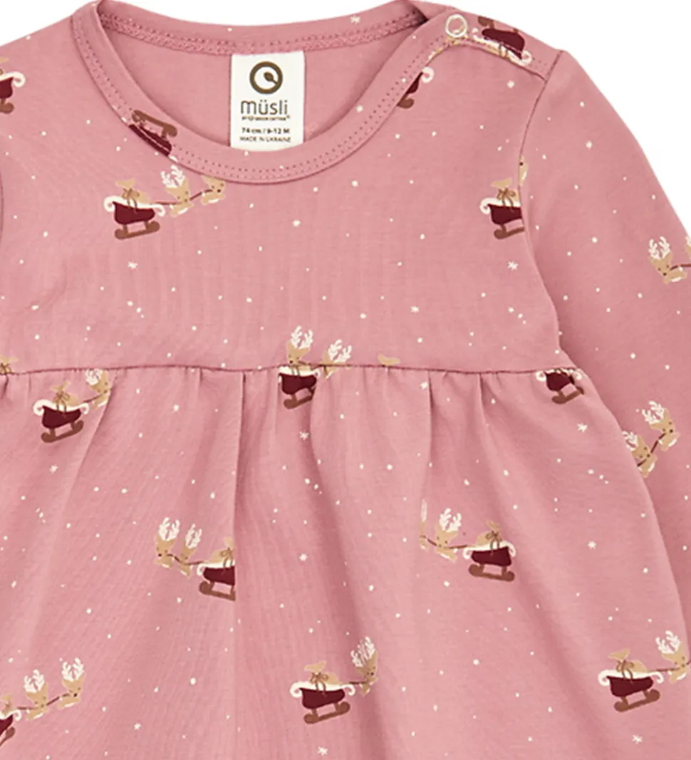 Charmerende Müsli kjolebody i en varm rosa nuance dekoreret med et sødt julemandsprint og små prikker. Müsli kjolebodyen har lange ærmer og rund hals med en praktisk trykknap ved venstre skulder. Bodyen har et langt skørt, så den ligner en kjole, og mellem benene lukkes den med trykknapper.