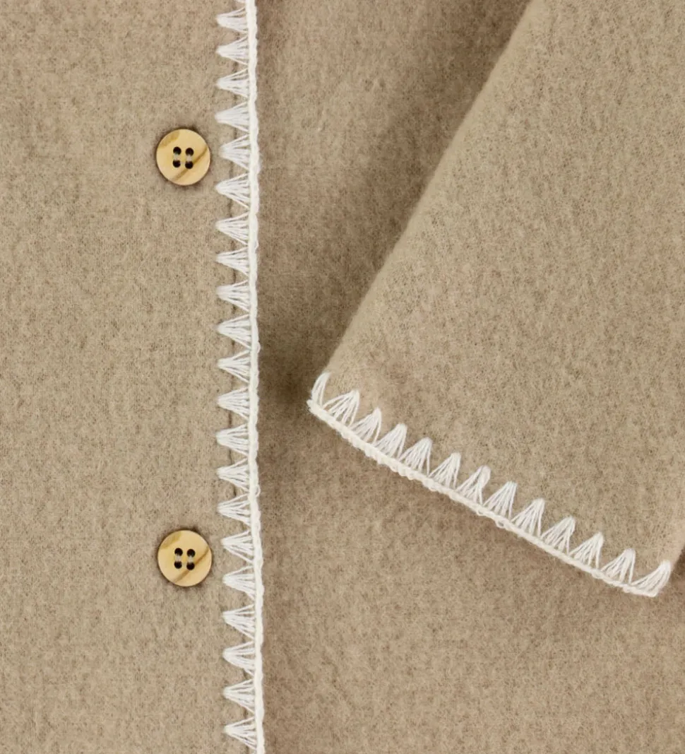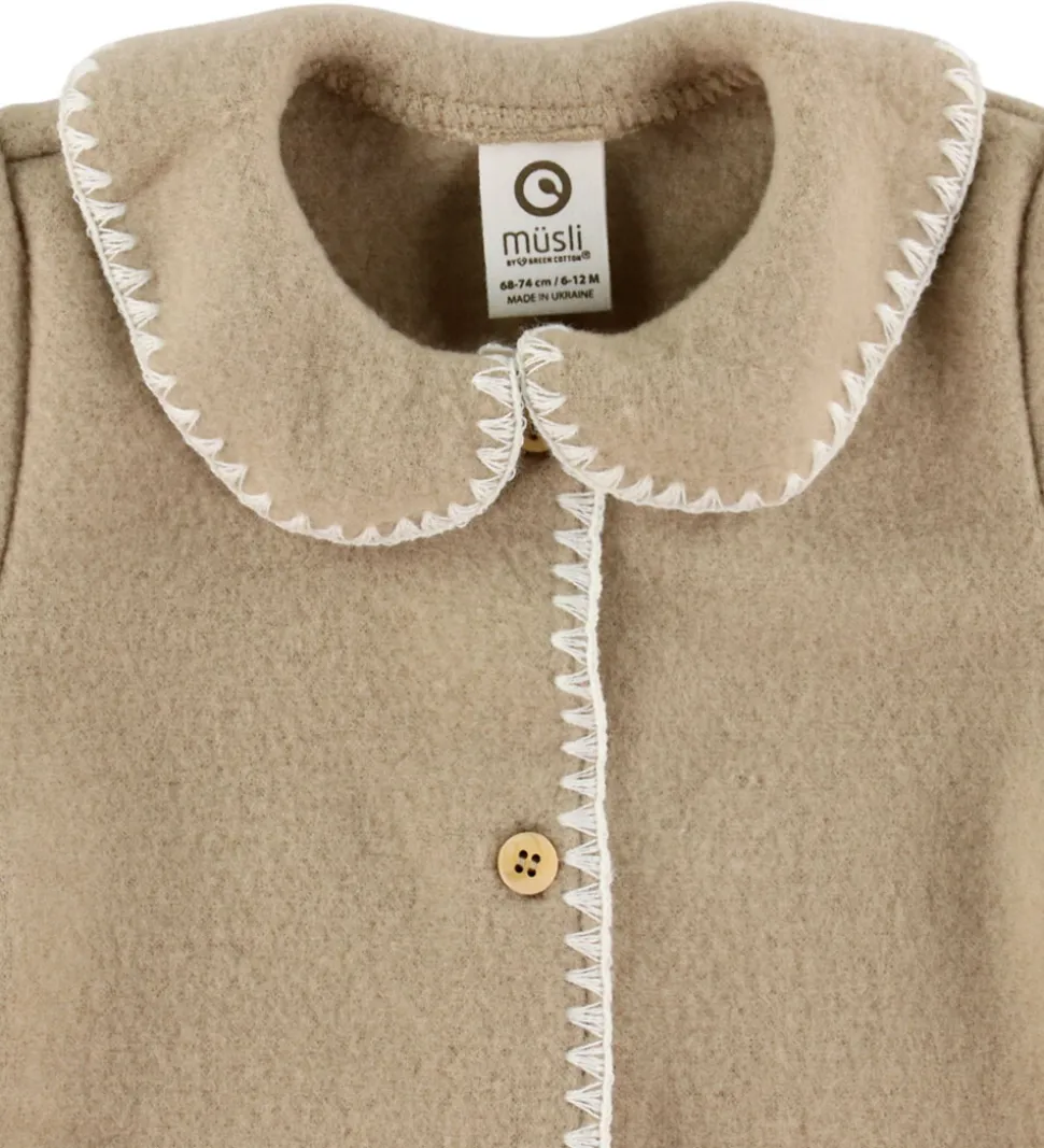 Elegant Müsli køredragt af uldfleece i en ensartet, beige farve med dekorative syninger langs kanterne.