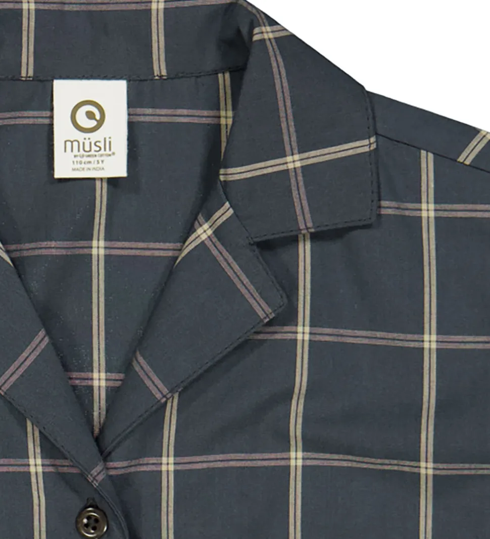 Smart Müsli skjorte i mørkeblå med ternet mønster. Skjorten er uden ærmer og har en flot krave og knaplukning fortil. Skjorten er en kort model med bindebånd nederst.