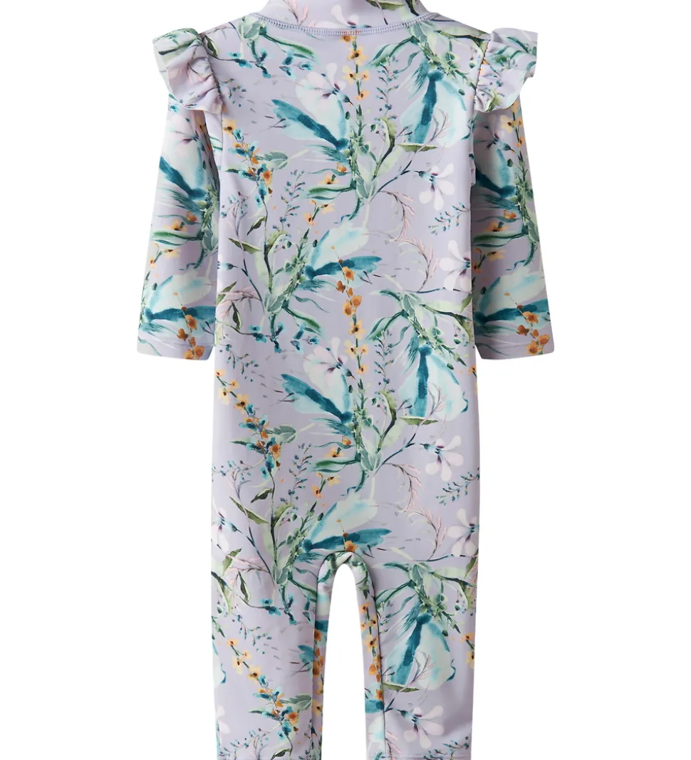 Fin Name It badeheldragt med 3/4 lange ærmer i en lys, lilla nuance med et farverigt blomsterprint. Badeheldragten har fine flæsedetaljer ved skuldrene, der giver et sødt udtryk.