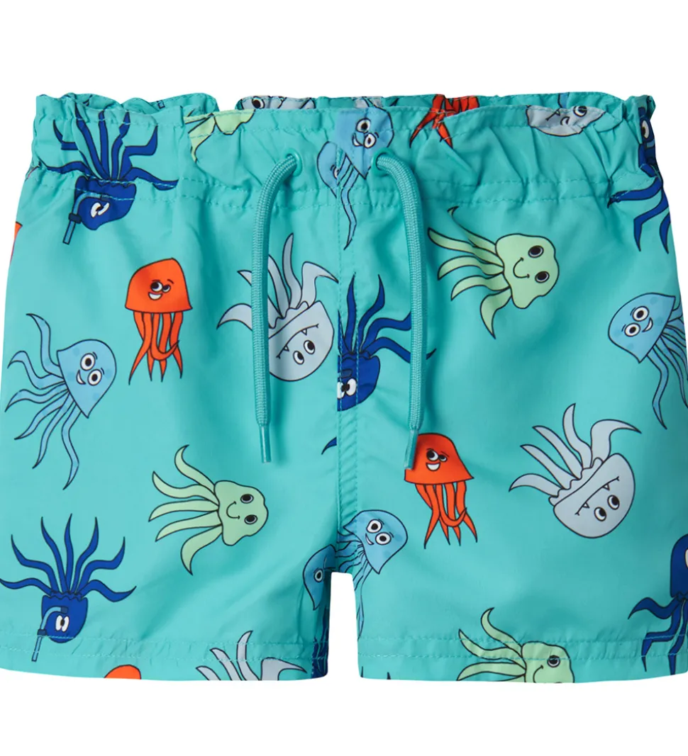 Lækre Name It badeshorts i en blå nuance med et sjovt blæksprutteprint. Badeshortsene har en praktisk snøre i taljen og er ideelle til strand- og svømmeoplevelser.