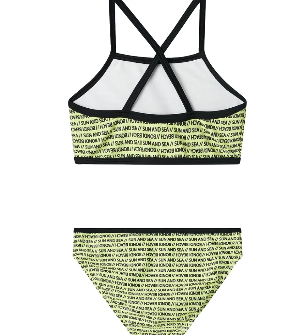 Smart Name It bikini i en klar grøn nuance med et mønster af tekst i sort, der siger “SUN AND SEA”. Bikiniens overdel har krydsende stropper og giver en moderne stil.
