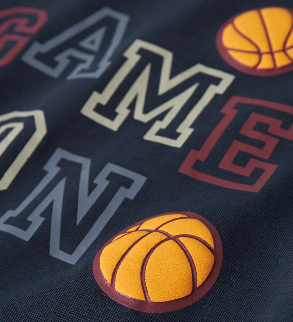 - Navyblå med teksten “Game On” i forskellige farver samt basketballs
