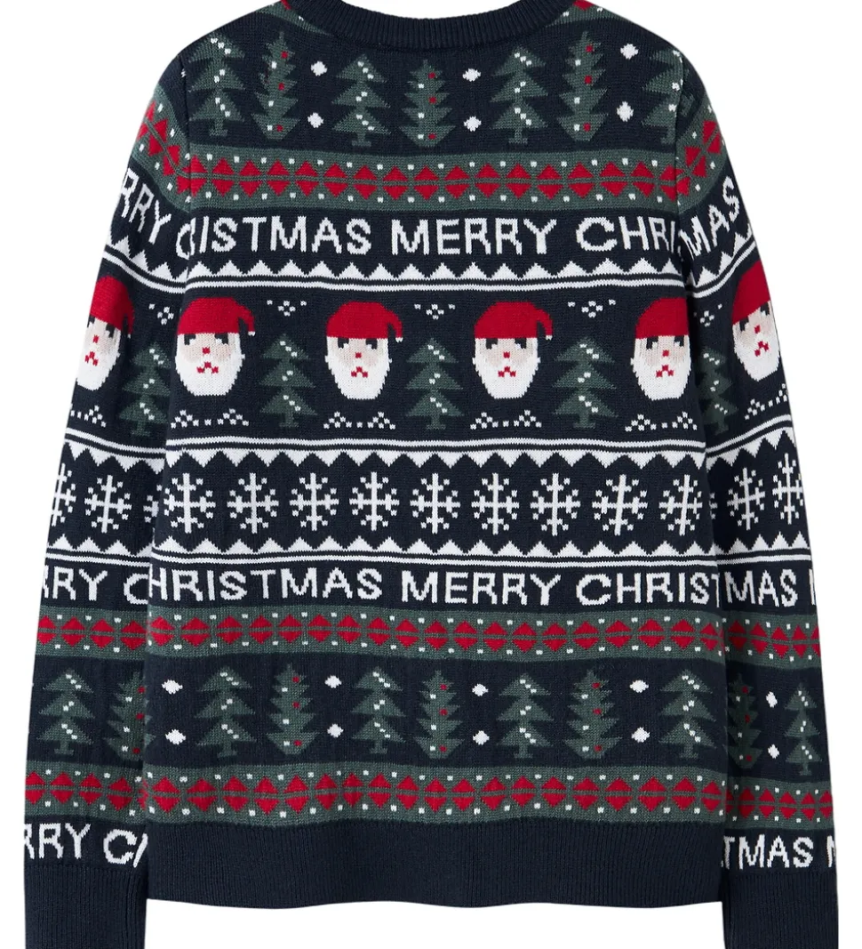 Festlig Name It bluse, hvor designet fanger øjet med sit julemotiv. Blusen er navy med et allover mønster, der inkluderer nisseansigter, juletræer, snefnug og teksten “Merry Christmas”. Den har en klassisk rund halsudskæring og ribkanter ved ærmerne.