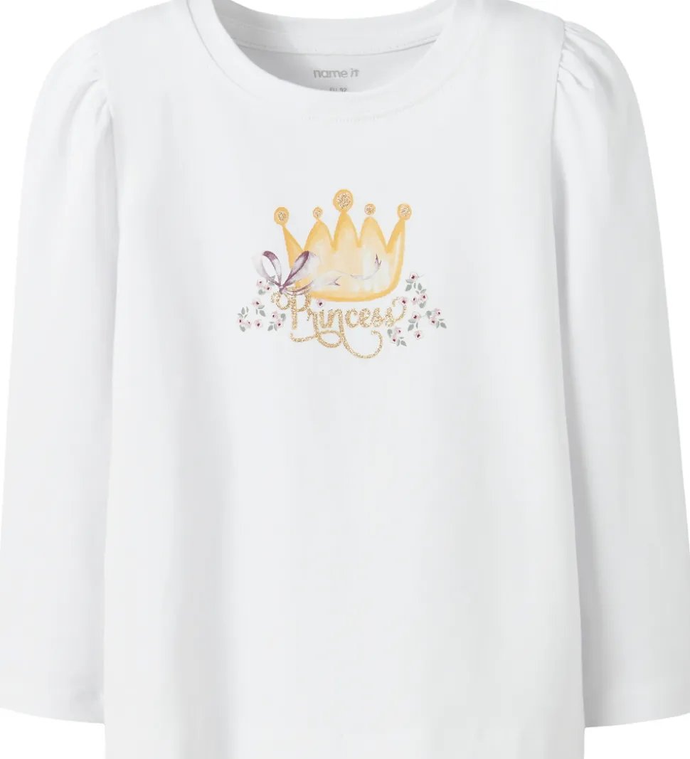 Elegant Name It bluse i hvid med print af en prinsessekrone, blomster og teksten “Princess” i guld glimmer. Blusen har en rund halsudskæring og lange ærmer med puf ved skuldrene.