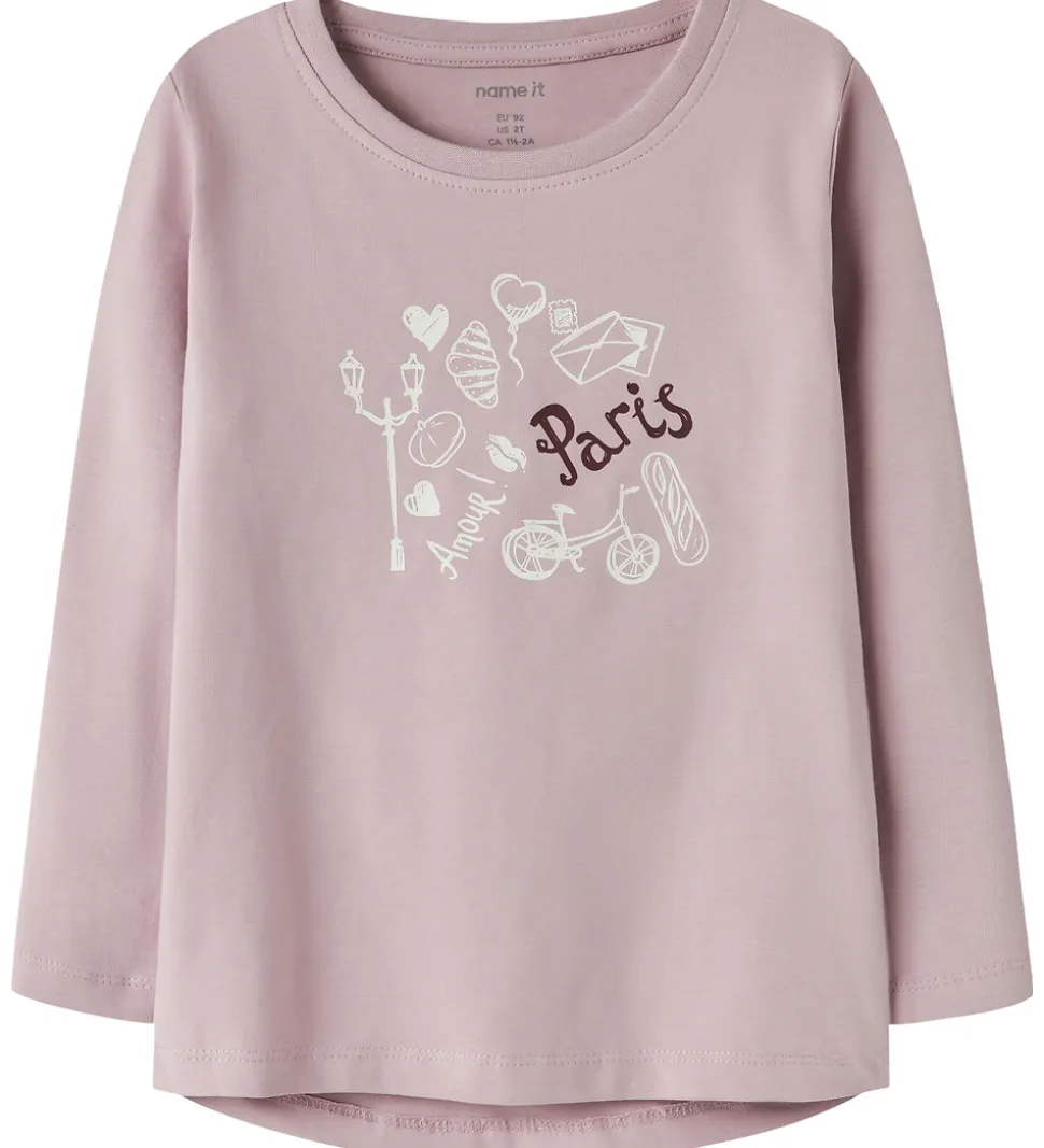 Charmerende Name It bluse i en blød lilla nuance med lange ærmer. Blusen har et print foran med teksten “Amour à Paris” omgivet af motiver med fransk tema. Blusen har en rund halsudskæring med en smal ribkant.