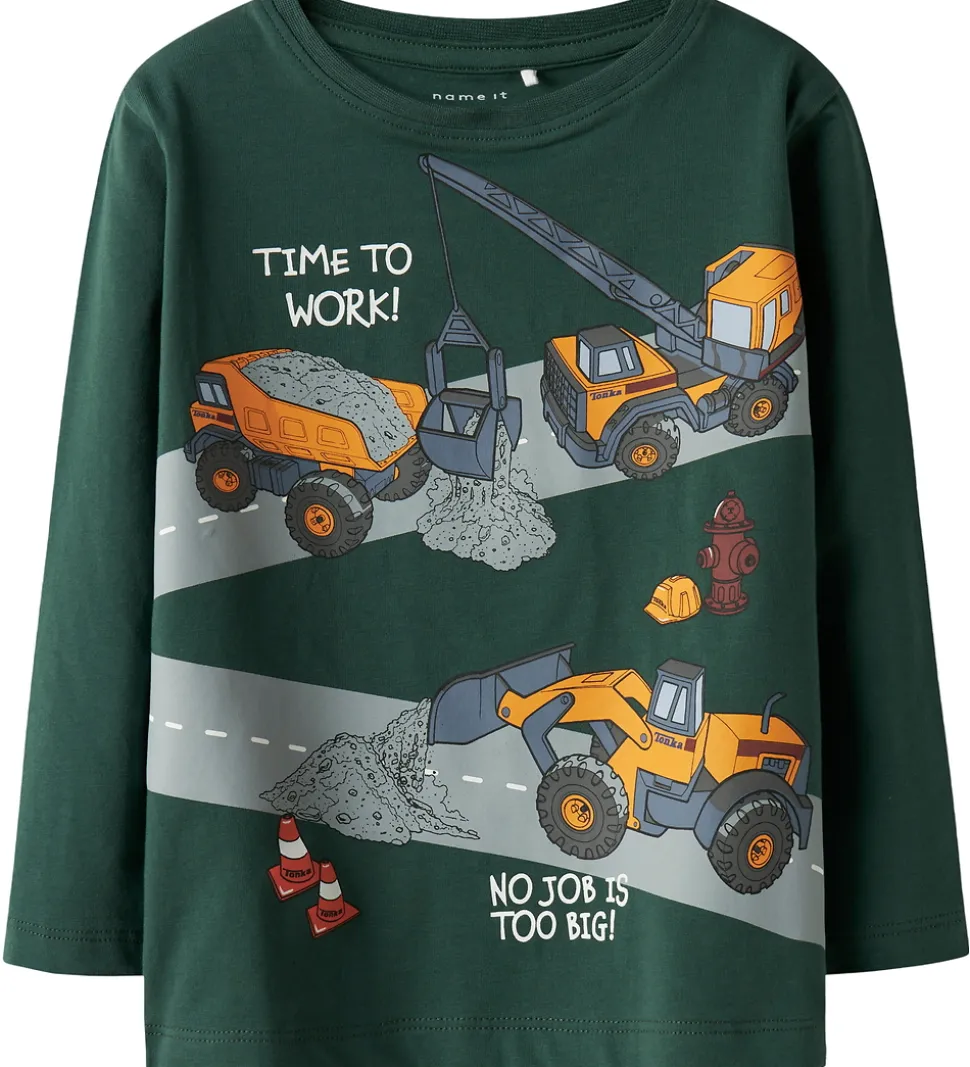 Smart Name It bluse med lange ærmer i en mørkegrøn nuance. Blusen har print på fronten og bagsiden af arbejdsmaskiner og tekstprint. Blusen har en rund halsudskæring for et klassisk look.