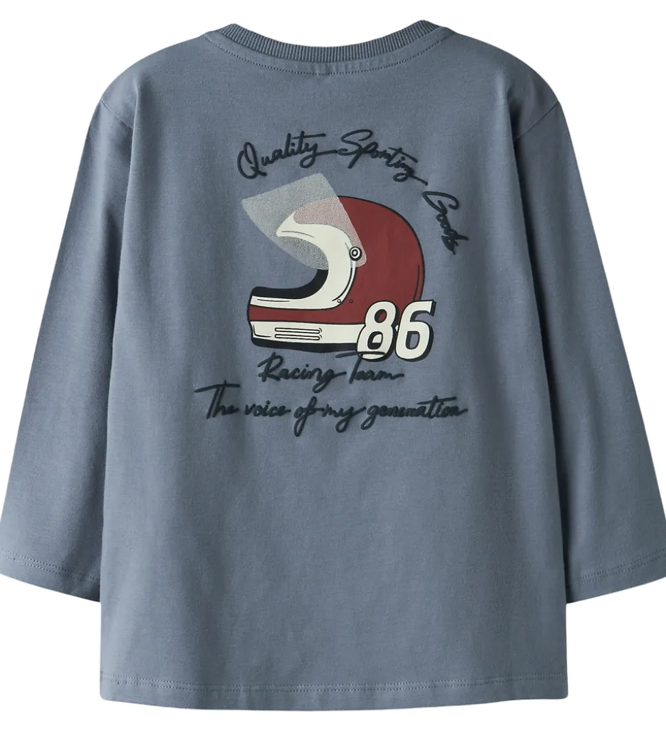 Stilfuld Name It bluse i en afdæmpet blå nuance med navyblåt tekstprint på brystet og på ryggen. På ryggen er der desuden et print af en rød hjem og tallet “86”. Blusen har en rund halsudskæring med en smal ribkant og lange ærmer.