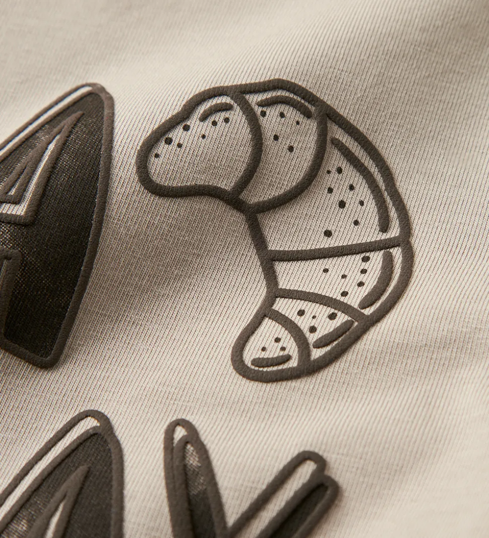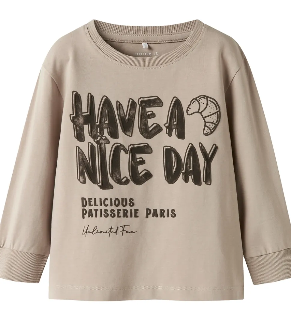 Skøn Name It bluse med lange ærmer i en afdæmpet beige nuance. Blusen har et stort print på forsiden med teksten “Have a Nice Day” og print af en croissant. Nederst står teksten “Delicious Patisserie Paris” samt “Unlimited Fun”. Blusen har en rund halsudskæring og ribkanter ved ærmerne.