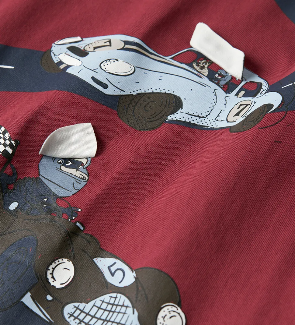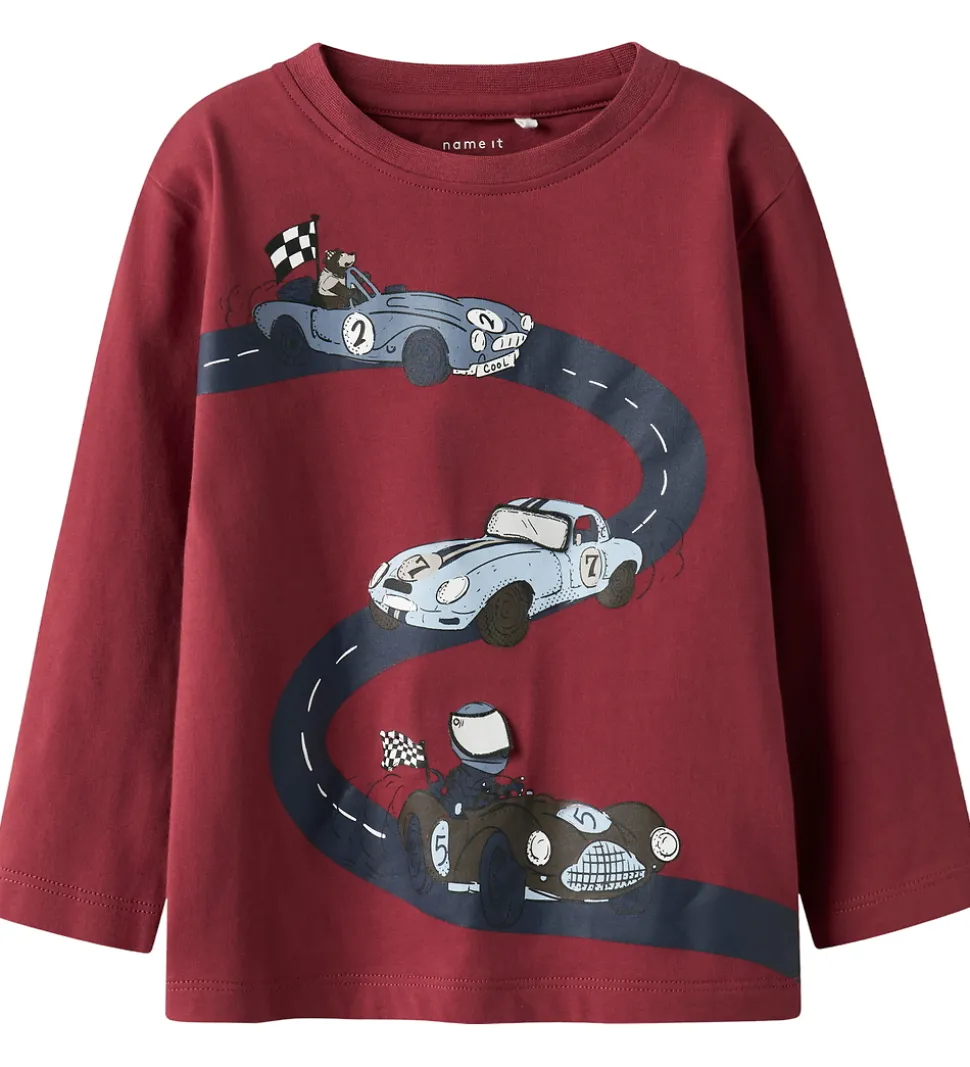Sporty Name It bluse i mørkerød med print af tre racerbiler på en snoet vej. Printet har påsyede flapper, som kan vippes op, så man kan se hvem der kører racerbilerne. Name It blusen har en rund halsudskæring med en smal ribkant og lange ærmer.
