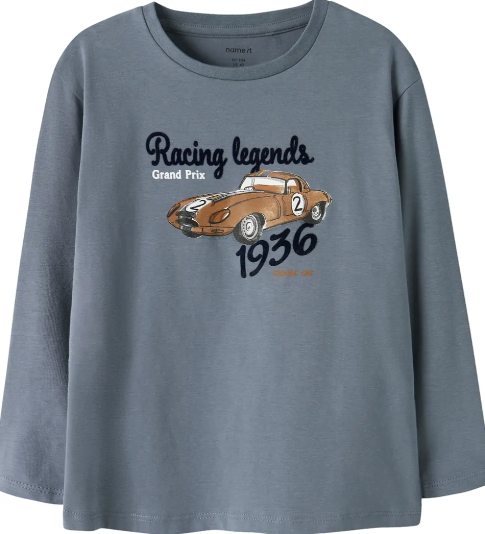 Flot Name It bluse med lange ærmer. Blusen er i en støvet blå nuance og har et print af en vintage racerbil med teksten “Racing legends Grand Prix 1936”. Den runde halsudskæring giver et klassisk look.