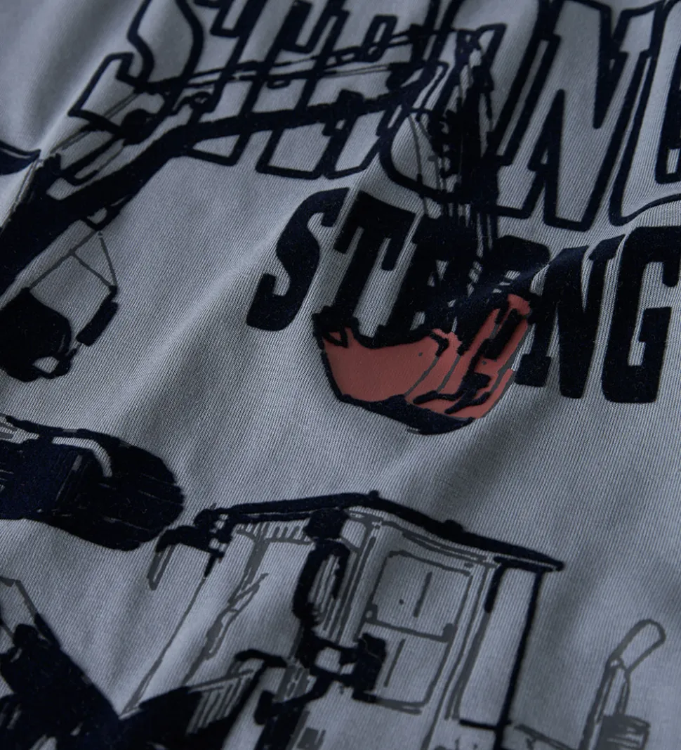Sej Name It bluse i grå med print i sort og rød på fronten af store arbejdsmaskiner og teksten “Strong”. Blusen har en rund halsudskæring med smal ribkant og lange ærmer.