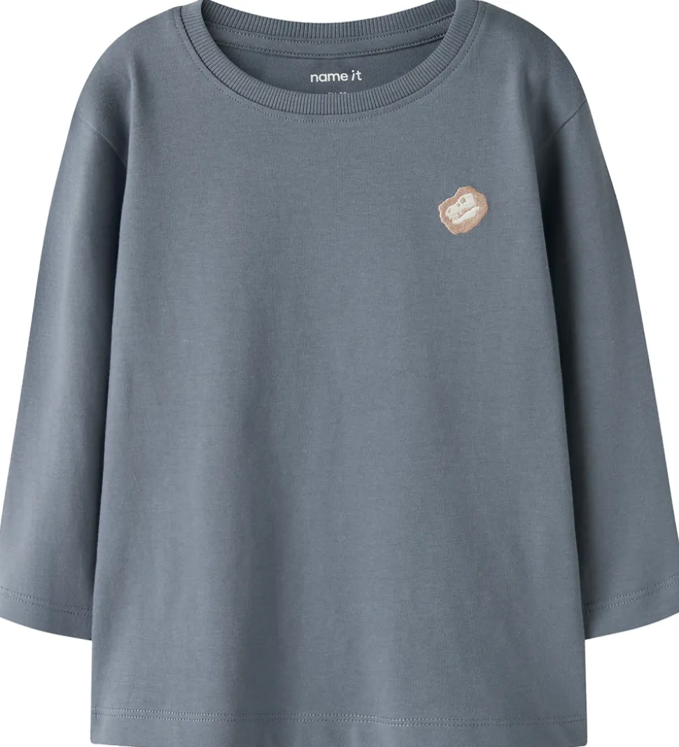 Fin Name It bluse i støvet blå med et lille, broderet dinosaurkanie på venstre bryst. Blusen har en rund halsudskæring med en smal ribkant og lange ærmer.