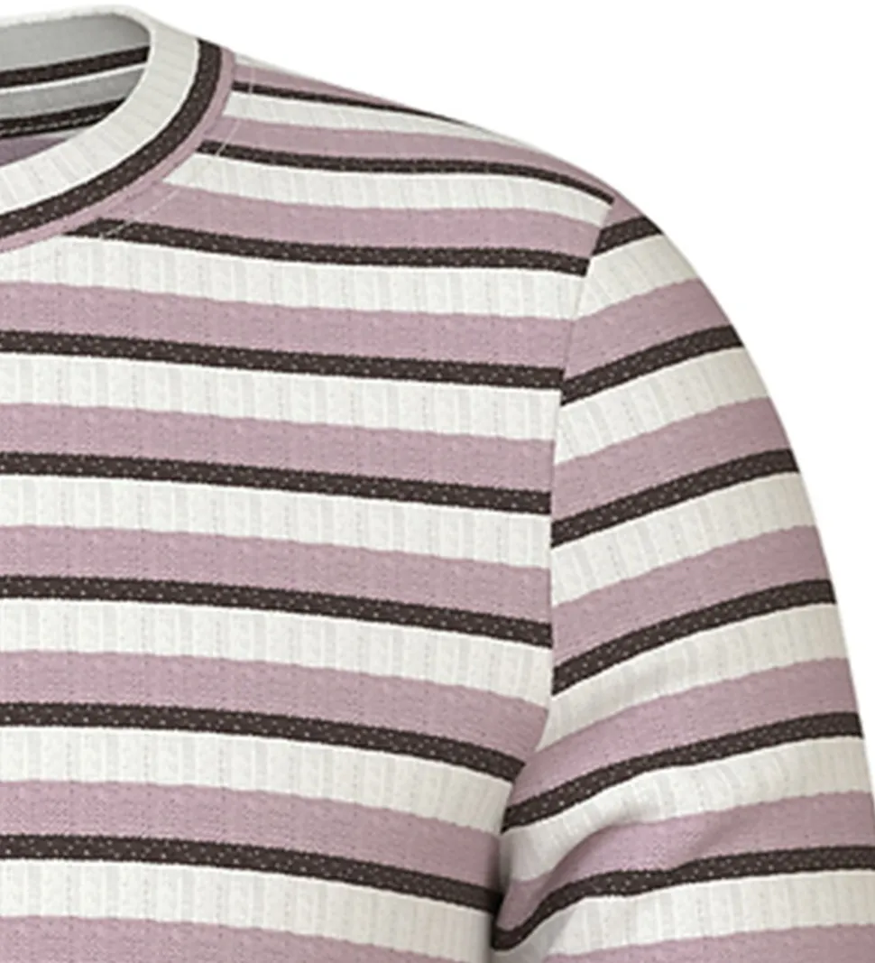 Smart Name It bluse med stribet design i hvid, rosa og mørekbrun med guld glimmer. Blusen har ribstruktur og en rund halsudskæring. Den har lange ærmer og bølgede kanter i ærme- og taljeåbning.