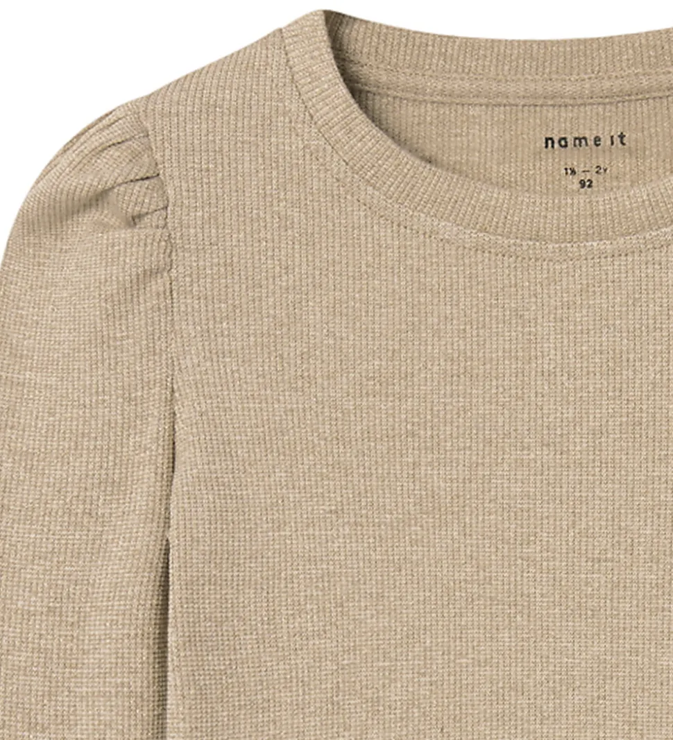 Elegant Name It bluse med lange ærmer i en mørkebeige nuance med guldfarvet glimmer.