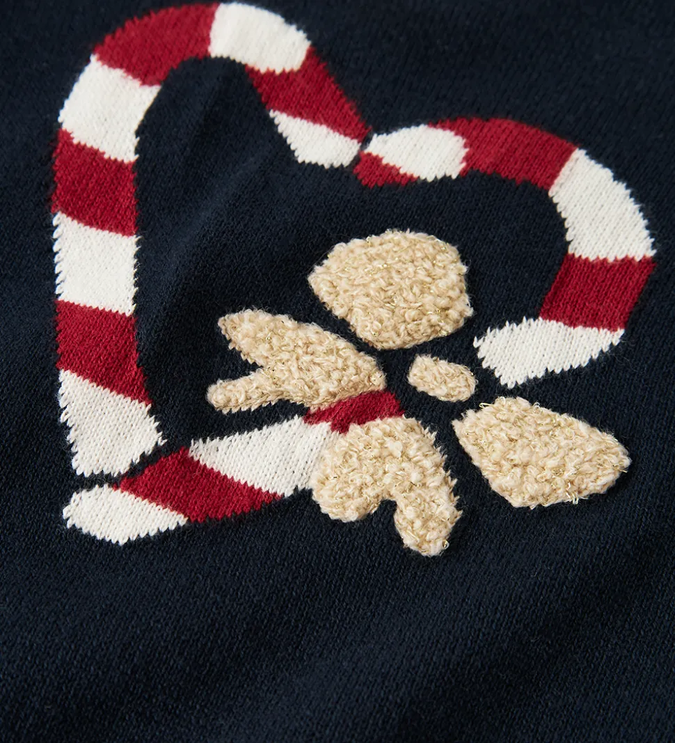 Skøn Name It bluse i navyblå strik med print på fronten af to slikstokke formet som et hjerte samt en sløjfe i beige frotté med glimmer. Blusen har en rund halsudskæring og lange ærmer med ribkanter.