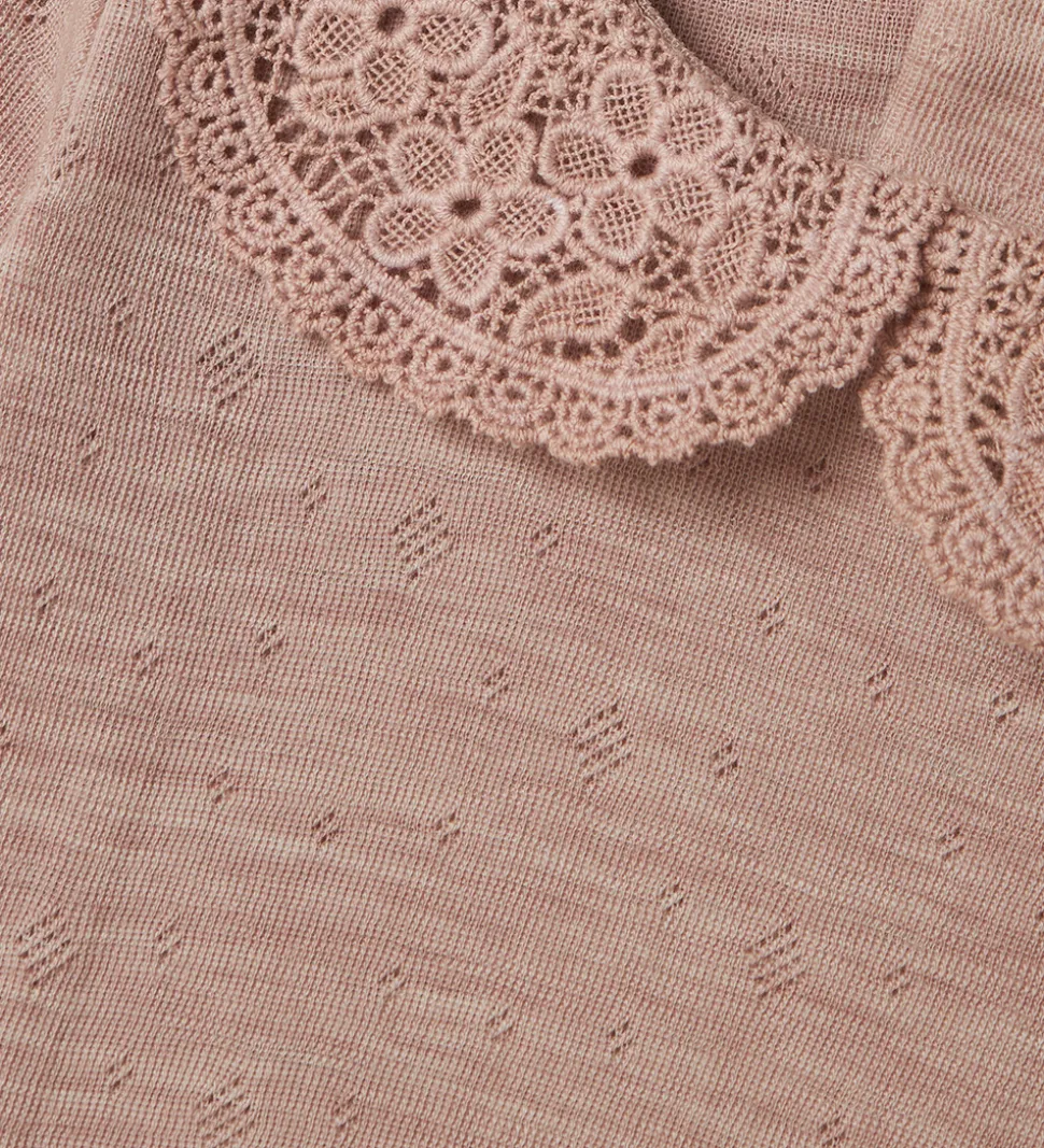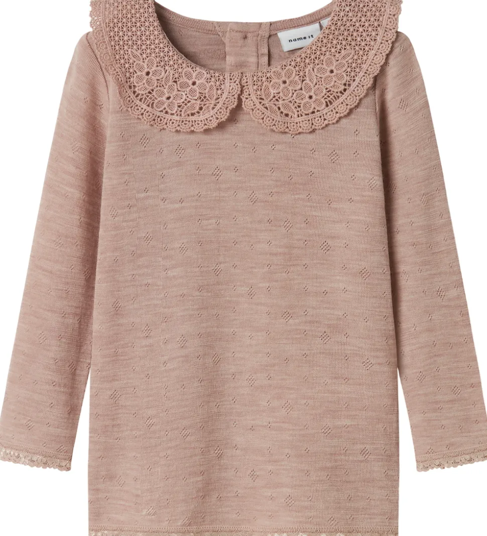Elegant Name It bluse i støvet rosa med fint hulmønster. Blusen har en blondekrave og knapper i nakken. Den har lange ærmer med blondekanter i ærme- og taljeåbning. Blusen er fremstillet af blødt merinould.
