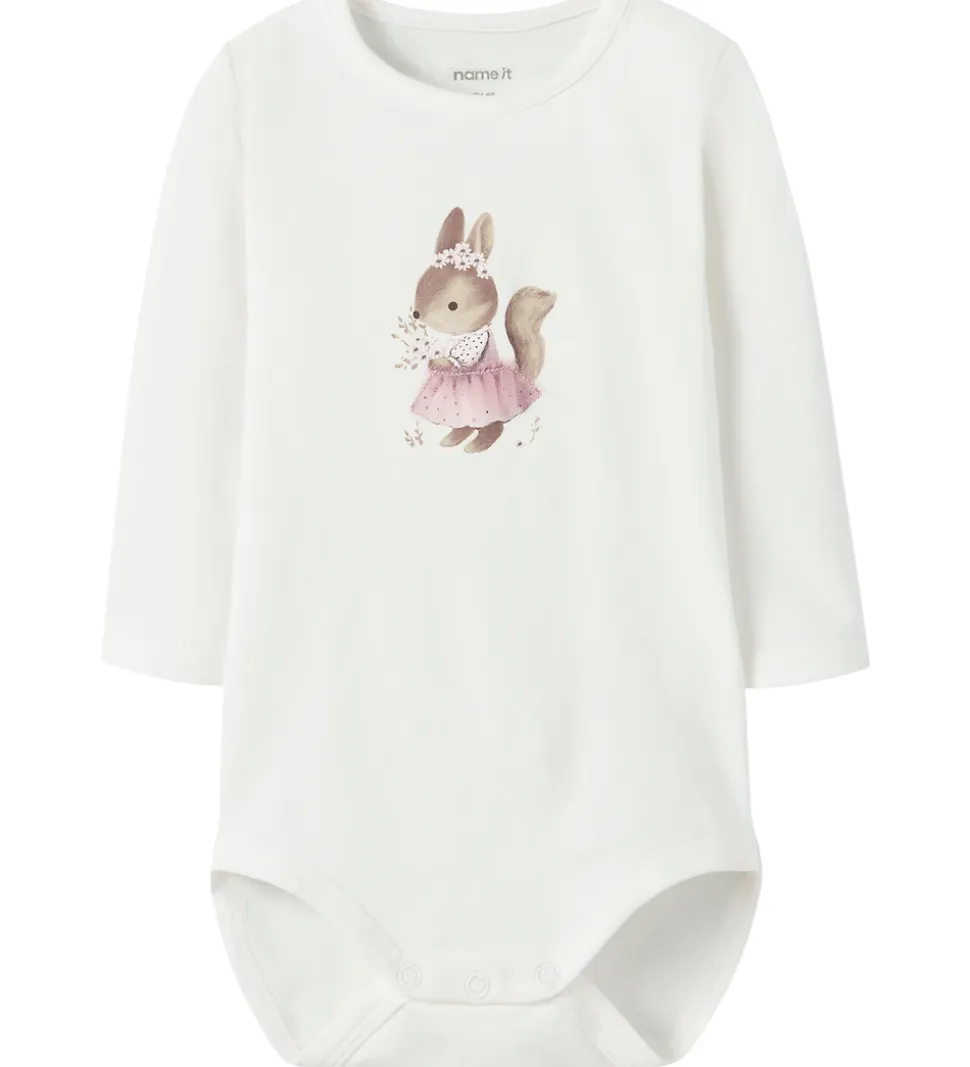 Charmerende Name It body i hvid med lange ærmer og et sødt print af en skovdyr i en fin lyserød kjole med en detalje i tyl. Bodyen har en rund halsudskæring med trykknapper ved venstre skulder. Den lukkes mellem benene med trykknapper.