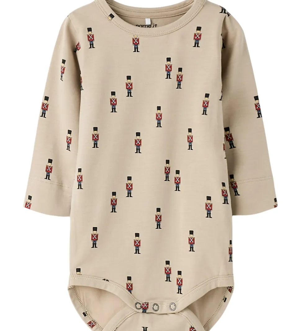 Fin Name It body med lange ærmer i en lys beige nuance. Bodyen er dekoreret med et mønster af små soldater i røde uniformer. Name It bodyen har rund halsudskæring og lukkes med praktiske trykknapper ved venstre skulder samt i bunden.