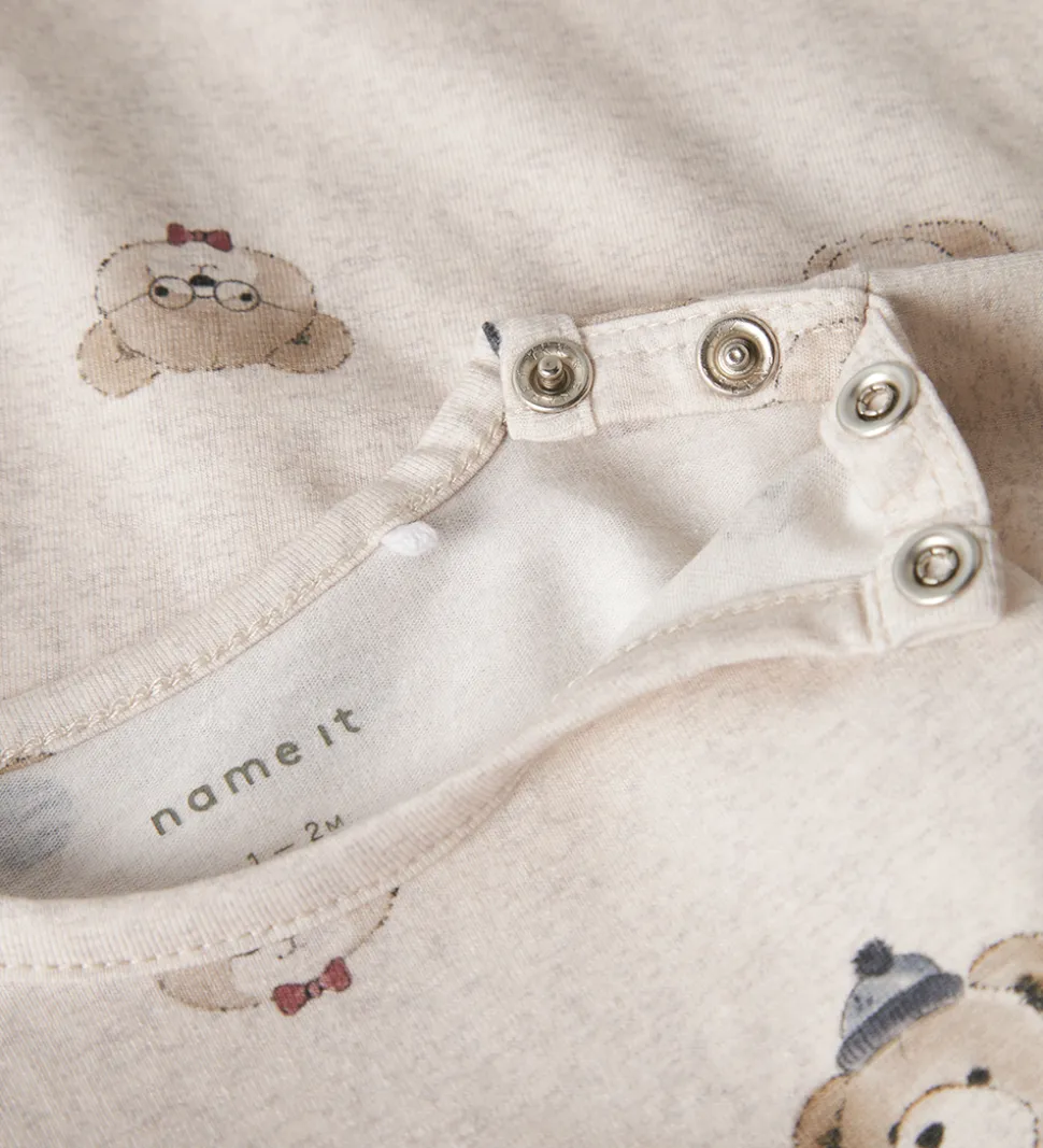 Fin Name It body i meleret beige med et alloverprint af søde bamser med briller og hatte. Bodyen har en rund halsudskæring med trykknapper ved venstre skulder og lange ærmer. Den lukkes mellem benene med trykknapper.