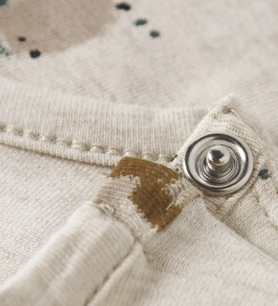 Fin Name It body i lys, meleret beige med dyreprint. Name It bodyen har en rund halsudskæring med en trykknap ved venstre skulder og lange ærmer. Den lukkes med trykknapper mellem benene.