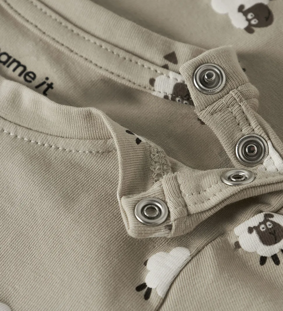 Charmerende Name It body med lange ærmer i en lysebrun nuance. Bodyen er dekoreret med et skønt får-print, som gentager sig over det hele og tilføjer et legende element til designet.
