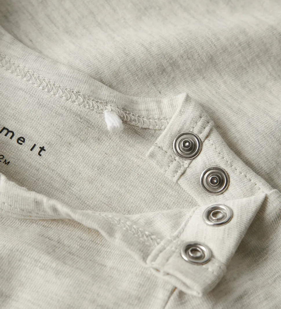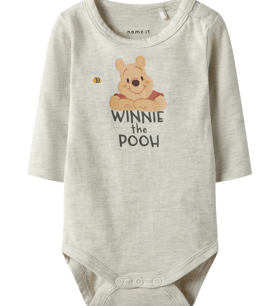 Sød Name It body med lange ærmer i meleret lysegrå. Bodyen har et charmerende print af Peter Plys på fronten med teksten “Winnie the Pooh”. Name It bodyen har en rund halsudskæring med trykknapper ved venstre skulder. Den lukkes med praktiske trykknapper mellem benene.