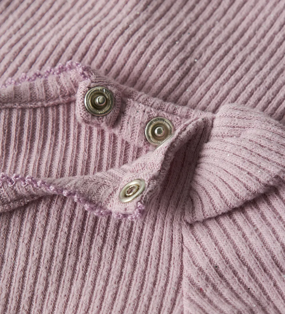 Blød Name It body i en delikat lilla nuance med fin ribstruktur og diskret glimmer. Bodyen har lange ærmer og en rund halsudskæring med dekorative kanter. Navnetabellen Name It sikrer praktisk lukning med trykknapper i bunden, hvilket letter påklædningen. De lange ærmer og den tætsiddende pasform giver en behagelig følelse mod huden.