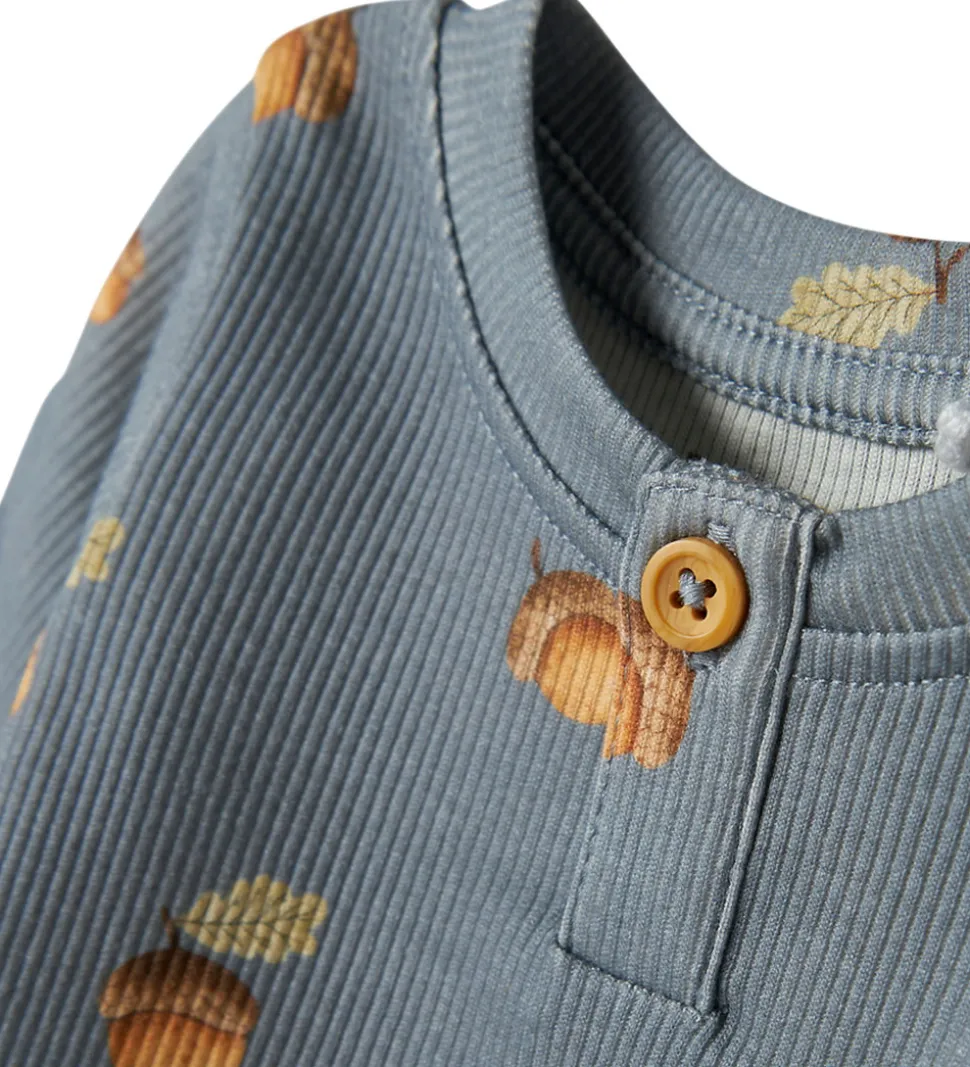 Lækker Name It body med lange ærmer i støvet blå med et sødt mønster af små agern i brune nuancer. Name It har skabt en body med lange ærmer, og fortil er der en flot knaplukning. Mellem benene er derr praktiske trykknapper.