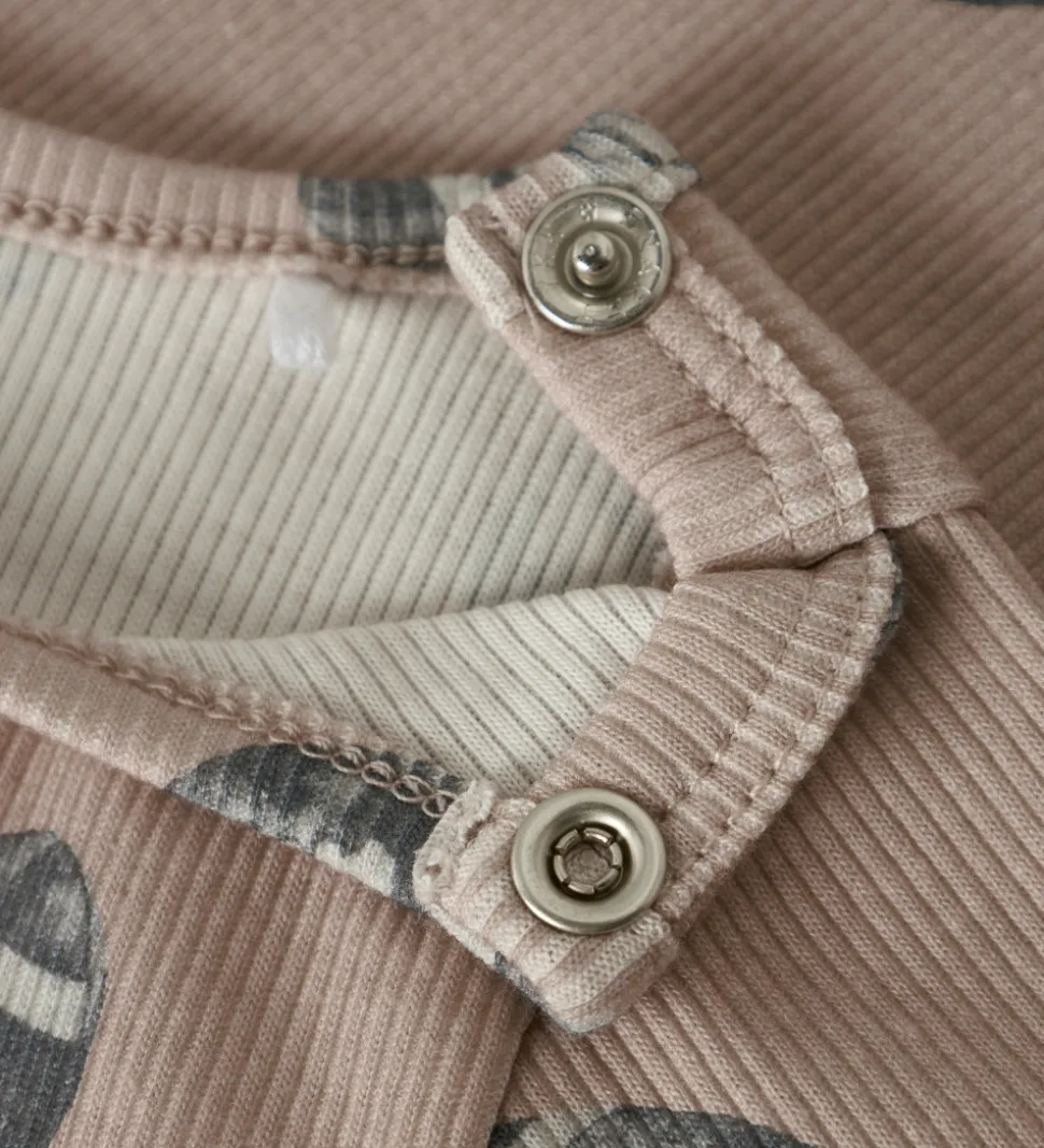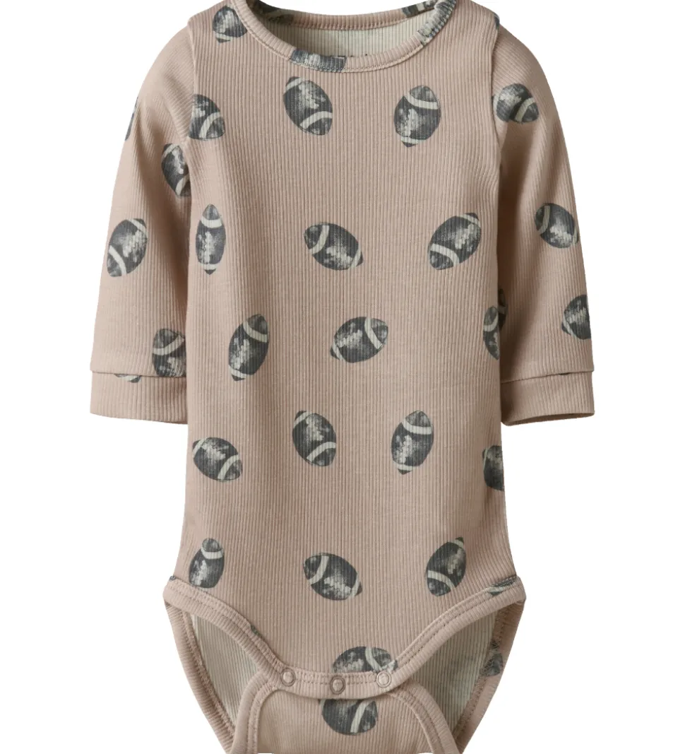 Flot Name It body i beige med et alloverprint af amerikanske fodbolde. Bodyen har diskret ribstruktur og lange ærmer. Den lukkes med trykknapper ved venstre skulder samt mellem benene.