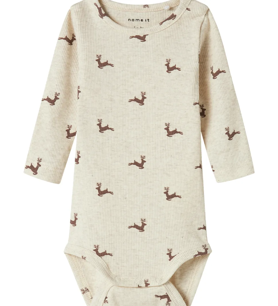 Fin Name It body i beige med et alloverprint af brune rensdyr. Bodyen har en fin ribstruktur og en rund halsudskæring med en trykknap ved venstre skulder. Den har lange ærmer og lukkes mellem benene med trykknapper.