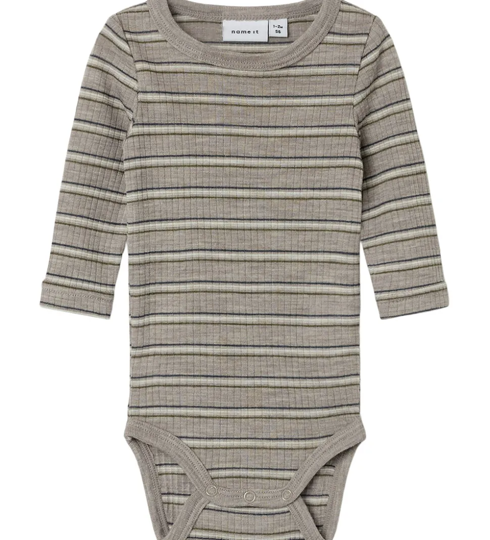 Skøn Name It body i gråbrun med ribstruktur og vandrette striber i blå, hvid og grøn. Bodyen har en rund halsudskæring og lange ærmer. Den lukkes med trykknapper mellem benene. Bodyen er fremstillet af merinould og modal.