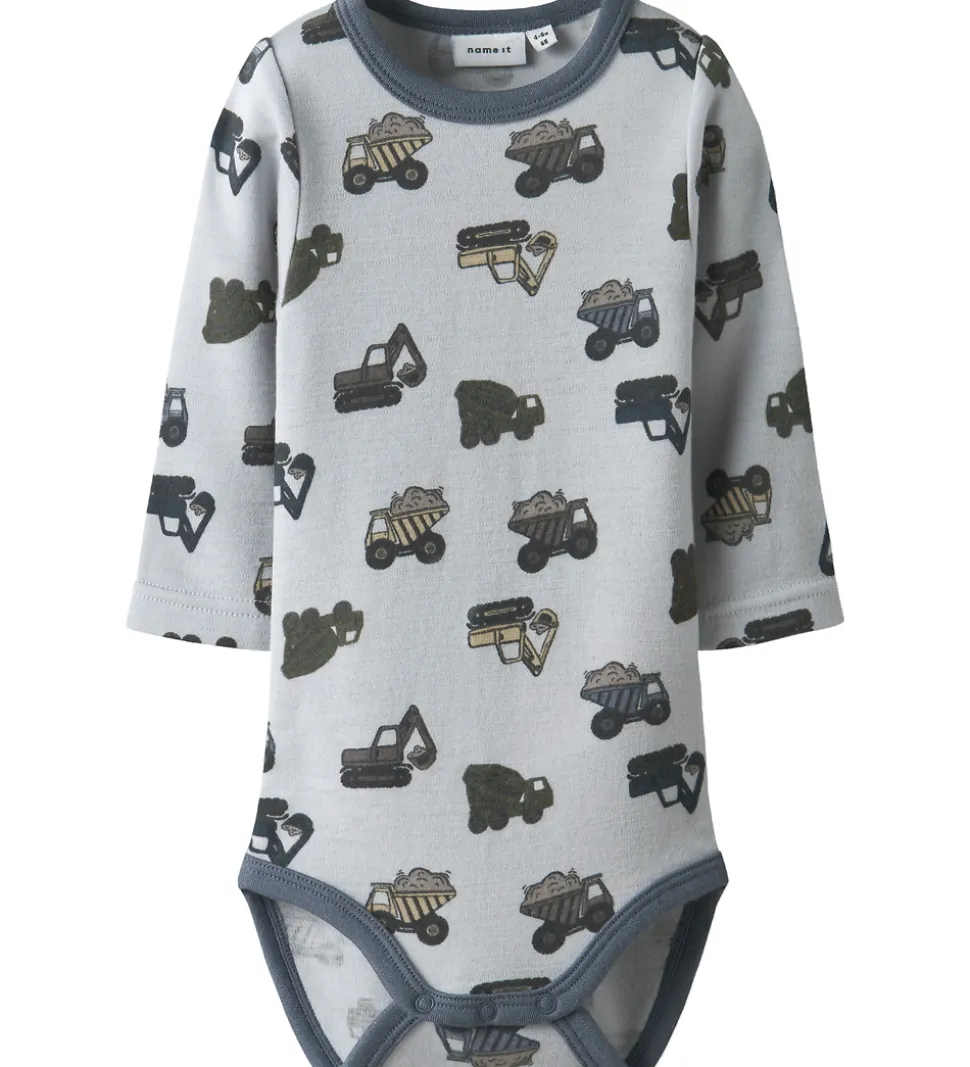 Flot Name It body i lyseblå med et alloverprint af arbejdsmaskiner. Bodyen har mørkeblå kanter. Den har en rund halsudskæring og lange ærmer, og lukkes mellem benene med trykknapper. Bodyen er fremstillet i lækkert merinould.