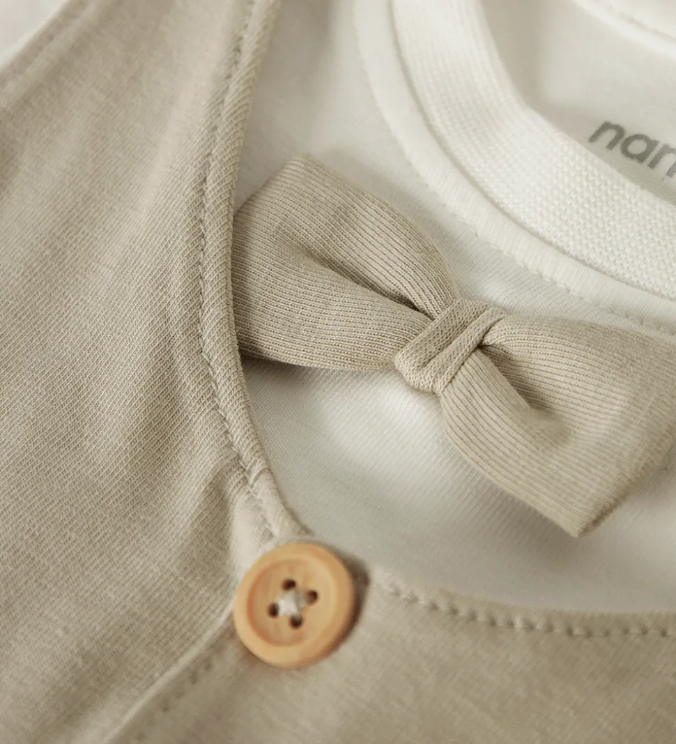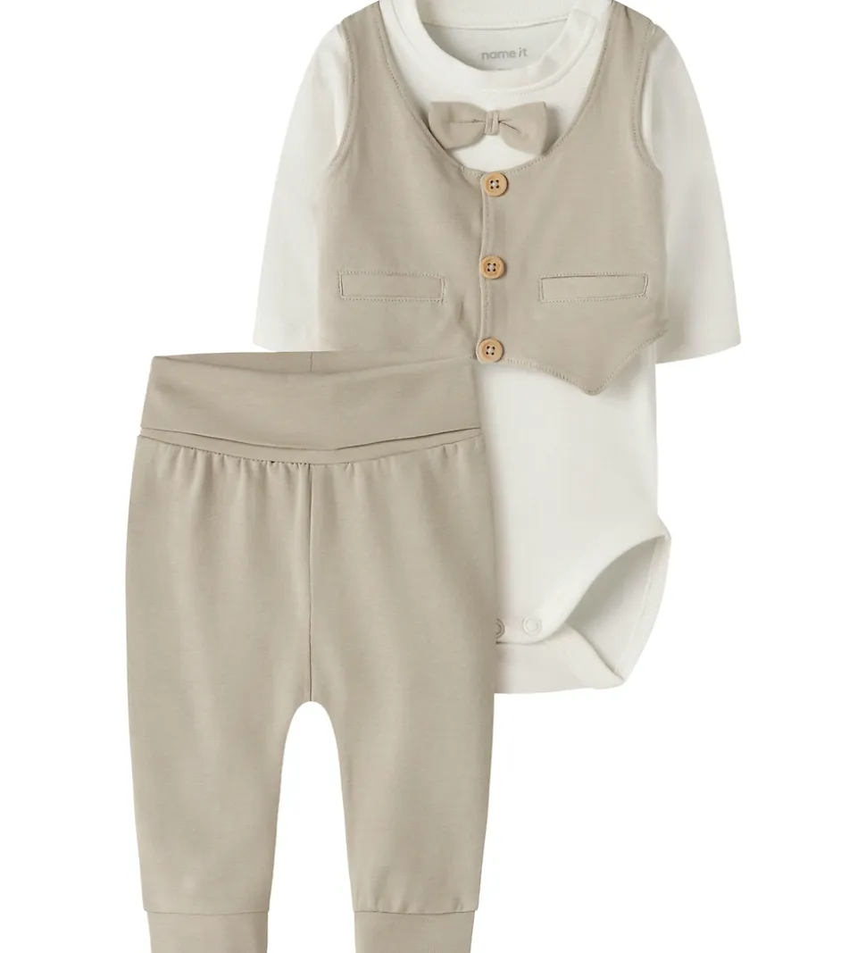 Elegant Name It sæt bestående af en body og et par bukser. Bodyen er hvid og har en påsyet, beigefarvet vest med fine knapper foran og butterfly. Bukserne er ensfarvet beige.