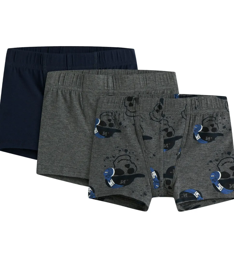 Praktiske Name It boxershorts i en pakke med tre forskellige designs. Der er et par i ensfarvet navy, et par i ensfarvet grå og et par grå med print.
