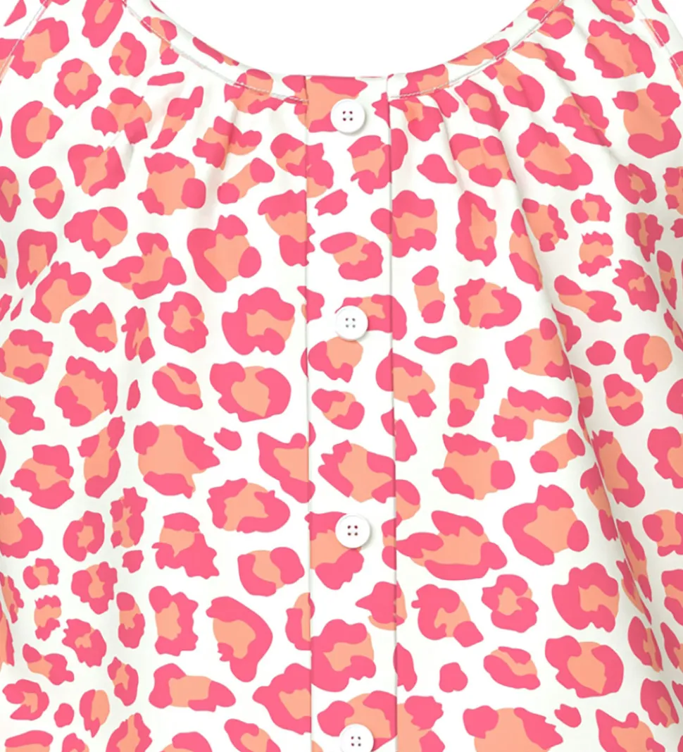 Flot Name It buksedragt med et iøjnefaldende leopardmønster i pink og nuancer af hvid. Name It buksedragten har tynde, justerbare stropper og knaplukning foran. I taljen ses en elastisk detalje, der tilføjer struktur til designet. Buksedragten har korte ben, hvilket giver et let udtryk. Stoffet er let og ideelt til varme dage.