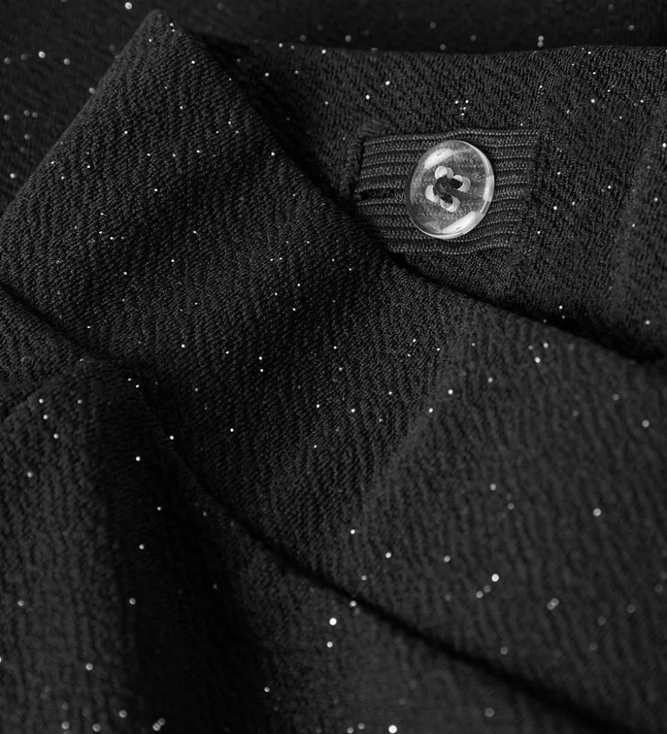 Stilfulde bukser fra Name It i sort med glimmer. Bukserne har en klassisk pasform med lige ben, der let går ud forneden. Buksebenene afsluttes med en ren kant uden rib, hvilket giver et enkelt udtryk. Den elastiske talje sikrer en behagelig pasform.