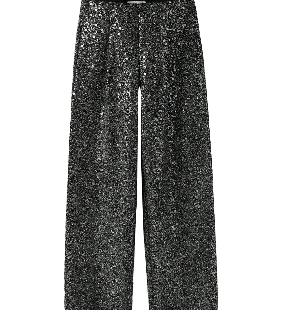 Flotte bukser fra Name It i sort med sølv glimmer og palietter. Name It bukserne har en løs pasform med elastik i taljen, der giver et behageligt fit.