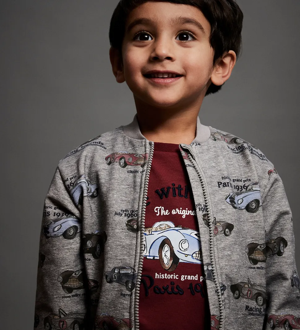 Skøn Name It cardigan i gråmeleret med print af racerbiler i forskellige farver og sort tekstprint. Name It cardiganen er udstyret med en praktisk lynlås foran og har ribkanter ved hals, ærmer og bund, hvilket giver en god pasform. Indvendigt er der blødt, børstet bomukld.