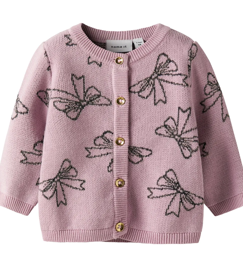 Charmerende Name It cardigan i en blød lyserød nuance med lange ærmer. Cardiganen har et delikat sløjfemønster i mørkere kontrast, der giver et elegant udtryk. Denne Name It cardigan har en rund halsudskæring og er forsynet med pæne knapper langs fronten. Ribkanter ved hals, ærmegab og bund sikrer en pæn afslutning.