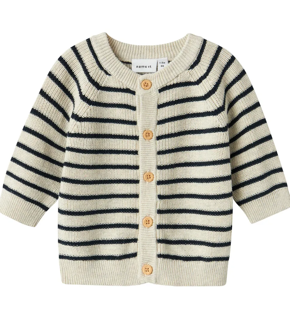 Lækker Name It cardigan med lange ærmer i en lys beige farve med klassiske marineblå striber. Cardiganen har praktiske knapper og giver et stilrent udtryk til ethvert outfit.