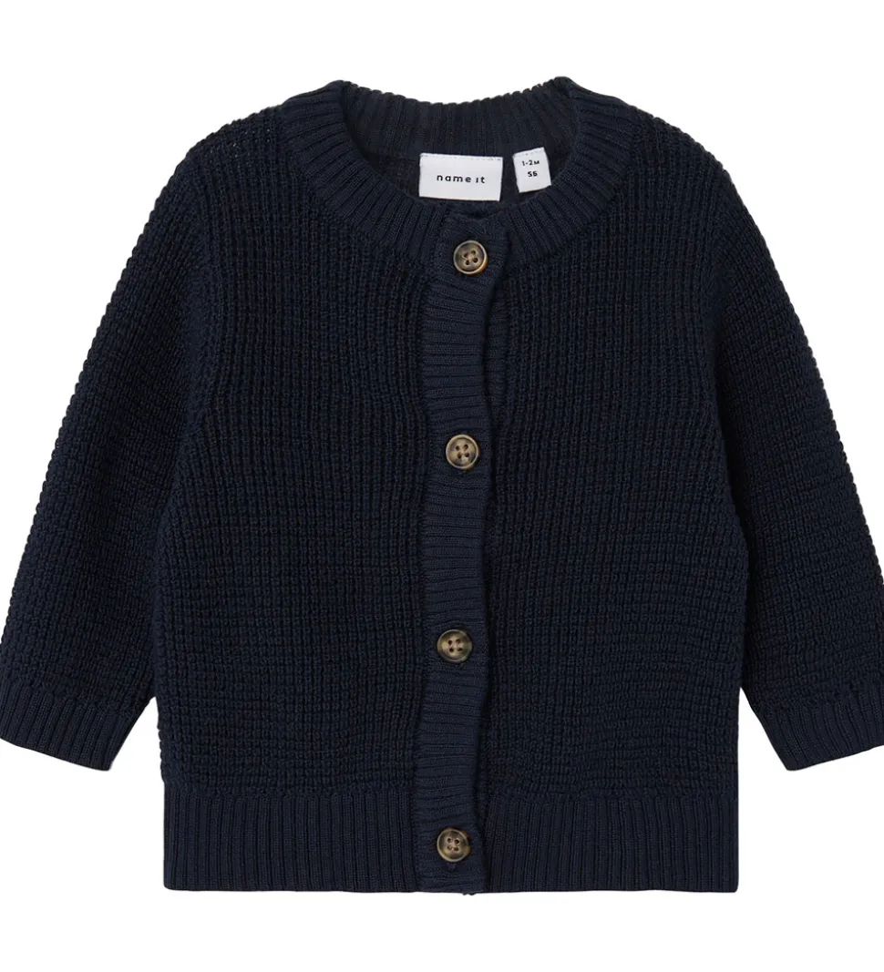 Lækker Name It cardigan i mørkeblå og i en flot vaflet mønsterstrik.