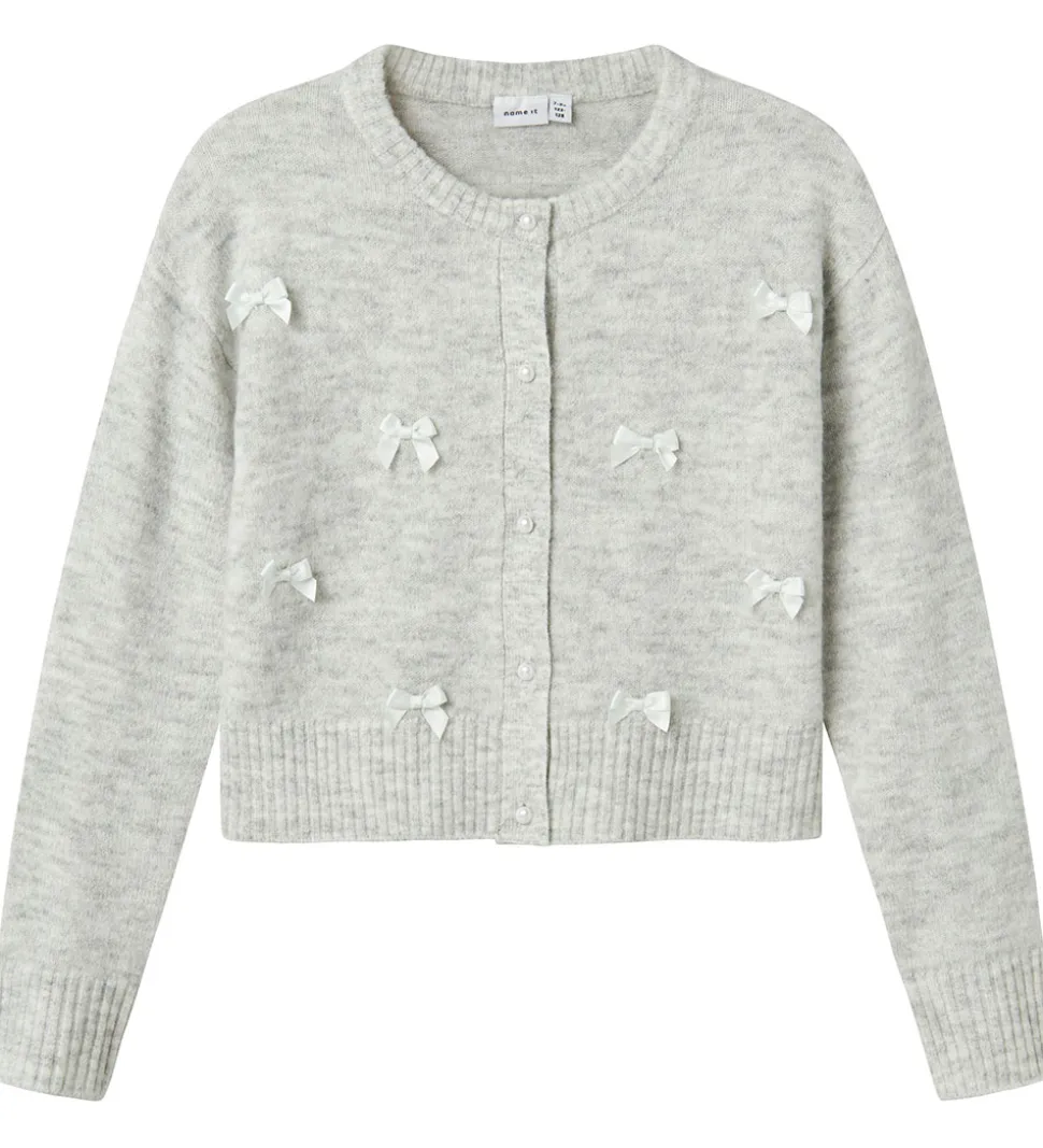 Cardiganen har små, dekorative sløjfer fordelt hen over fronten, hvilket tilføjer en fin detalje til designet. Name It cardiganen lukkes med knapper langs fronten, hvilket gør det nemt at tage den på og af.