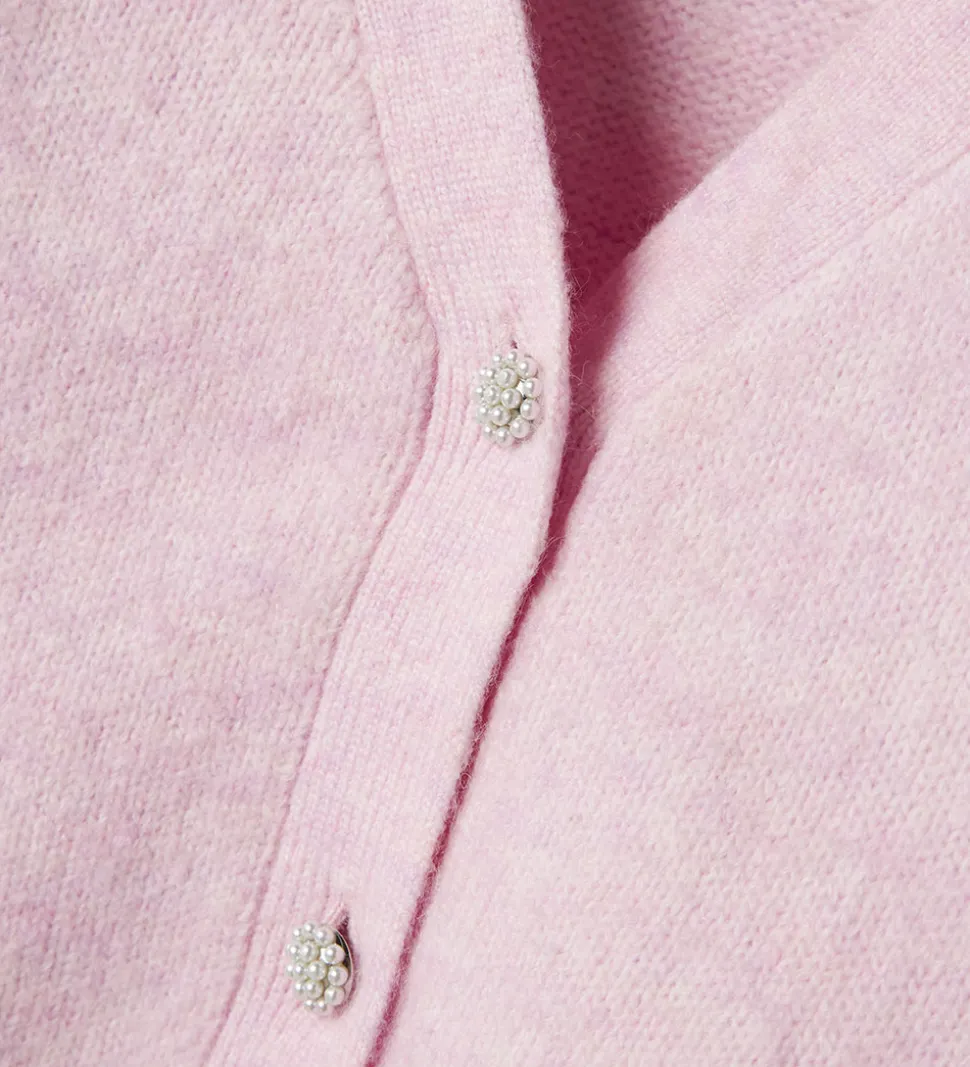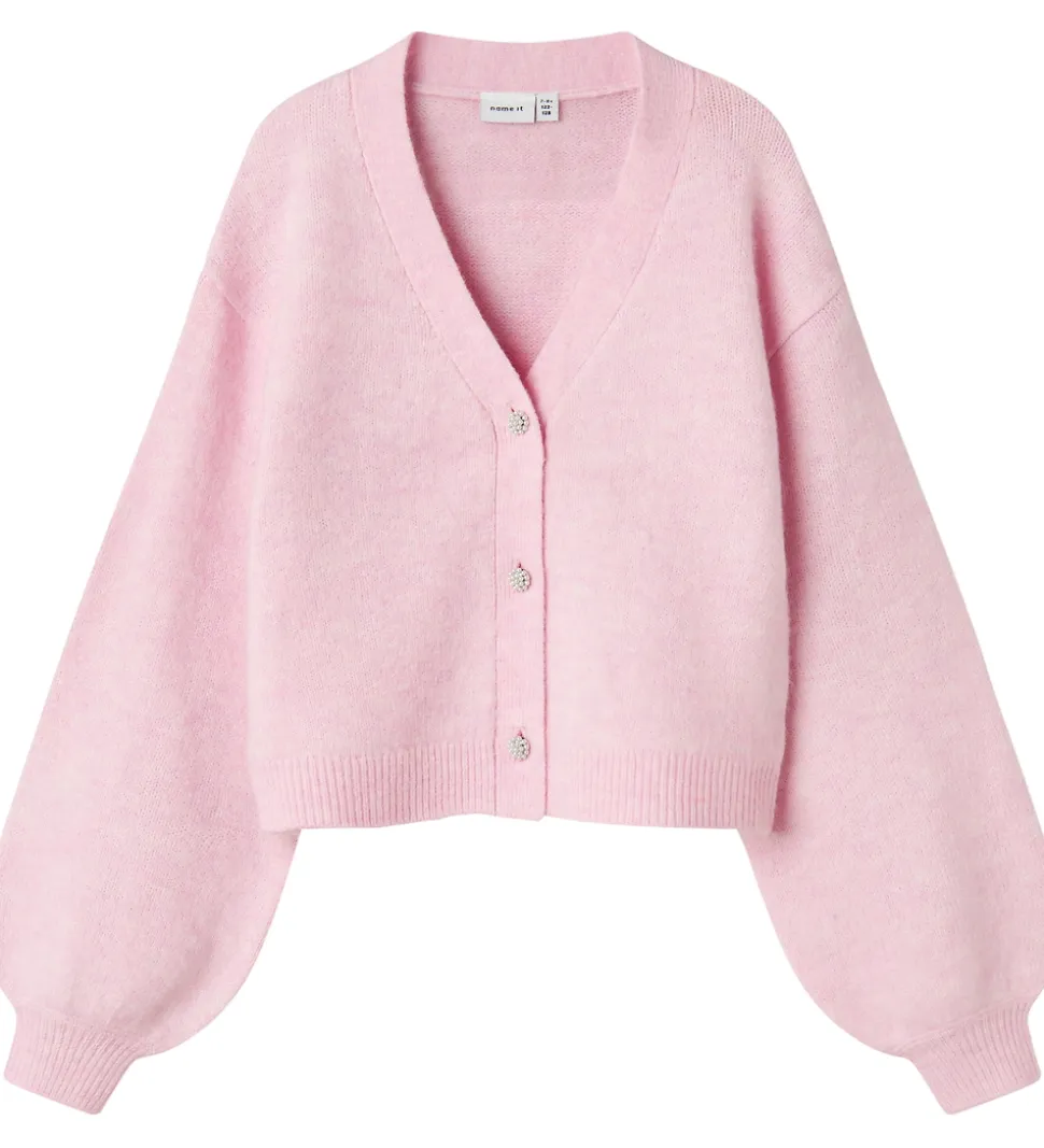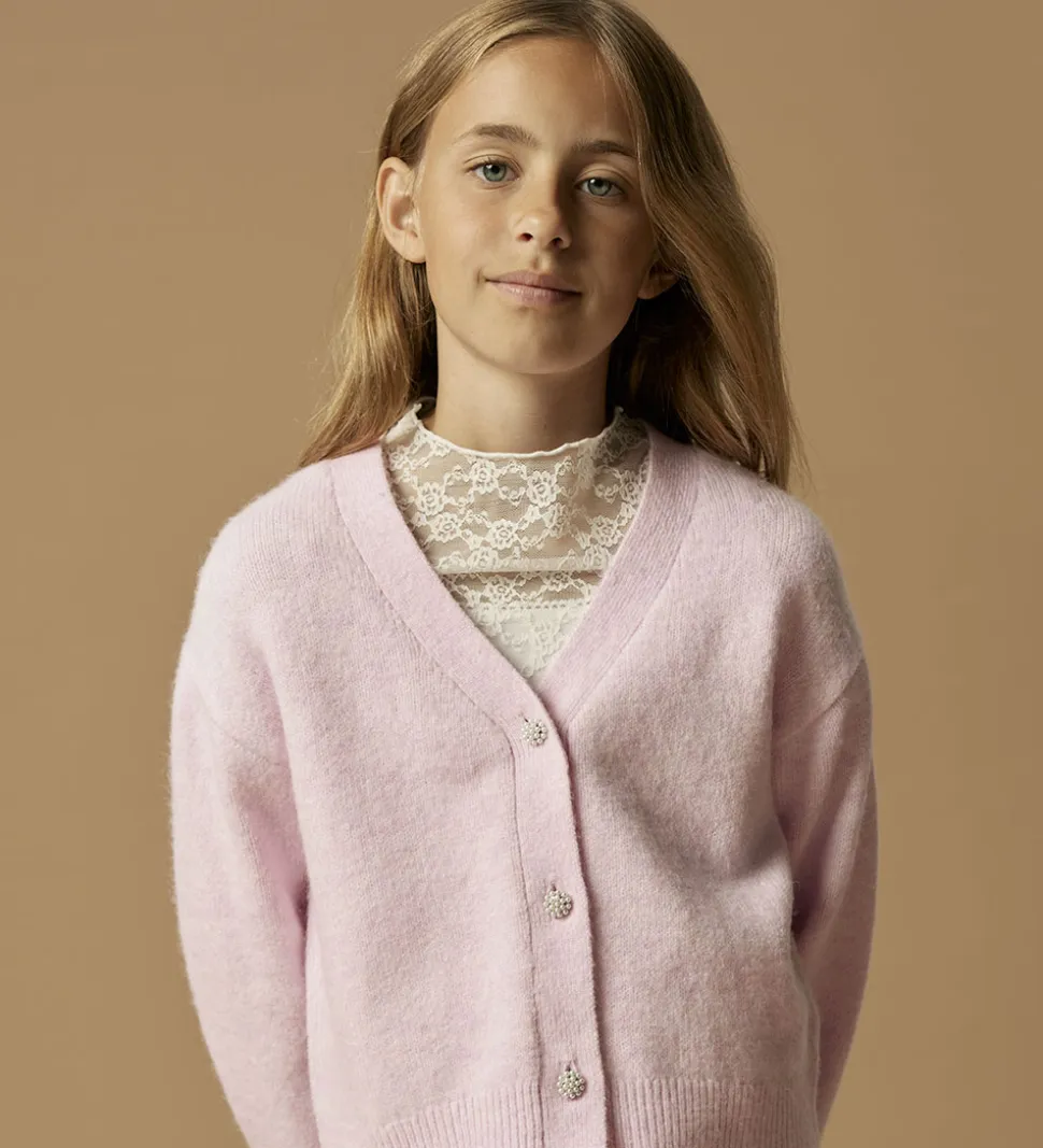 Flot Name It cardigan i en lys, rosa farve med lange ærmer.