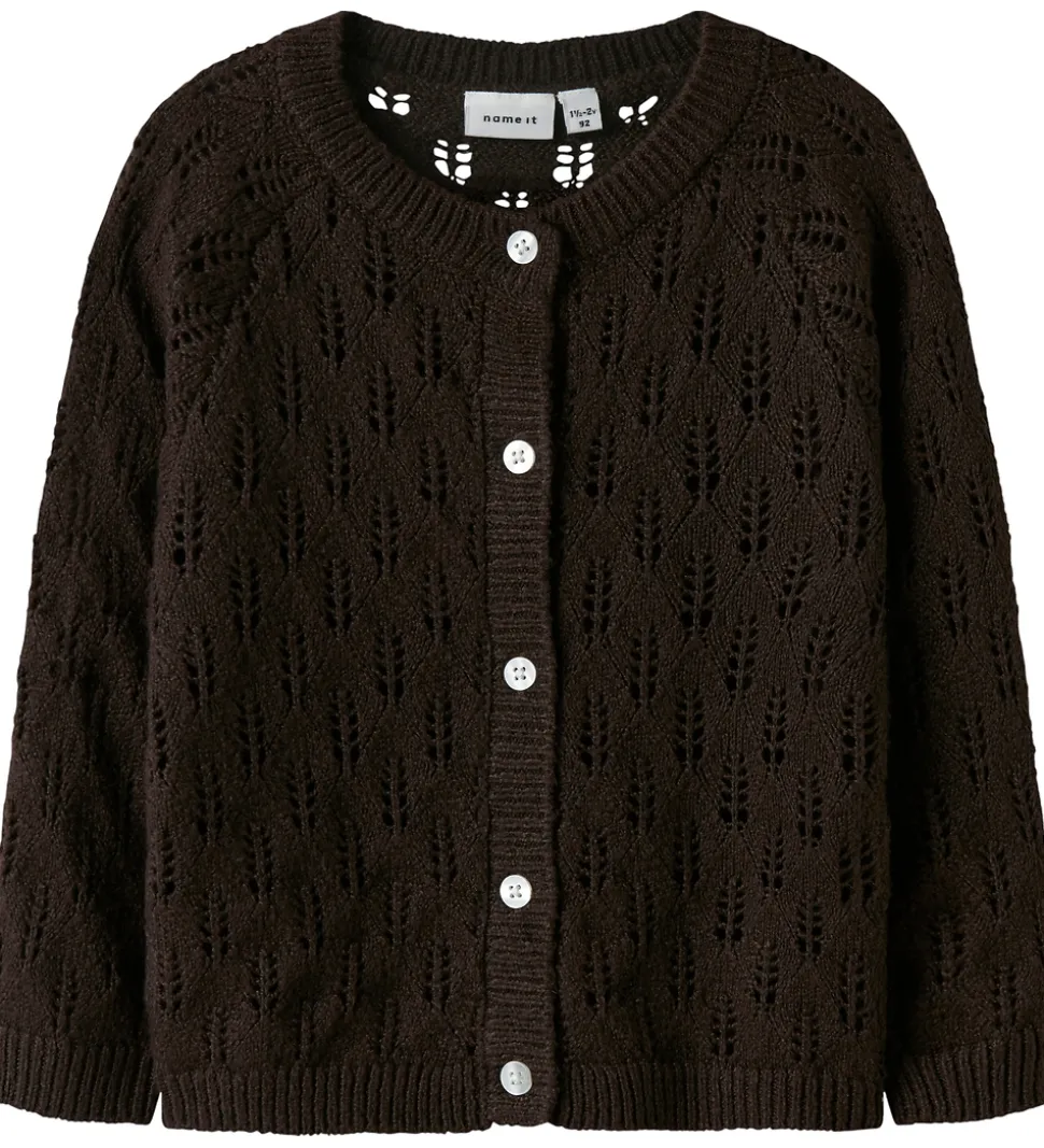 Charmerende Name It cardigan i en mørkebrun nuance med lange ærmer.
