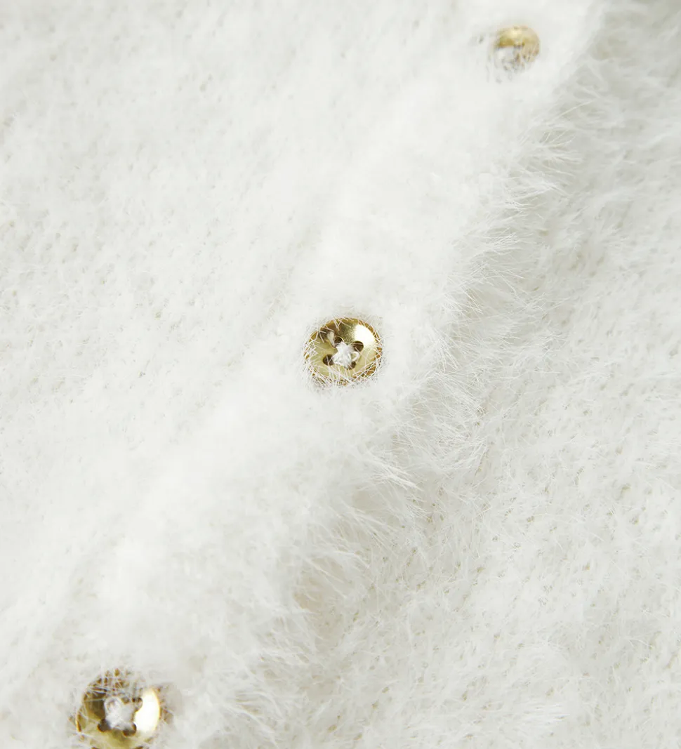 Skøn Name It cardigan i hvid strik med lodden struktur. Cardiganen har en rund halsudskæring og gennemgående knapper i guld foran. Den har lange ærmer og smalle ribkanter i alle åbninger.